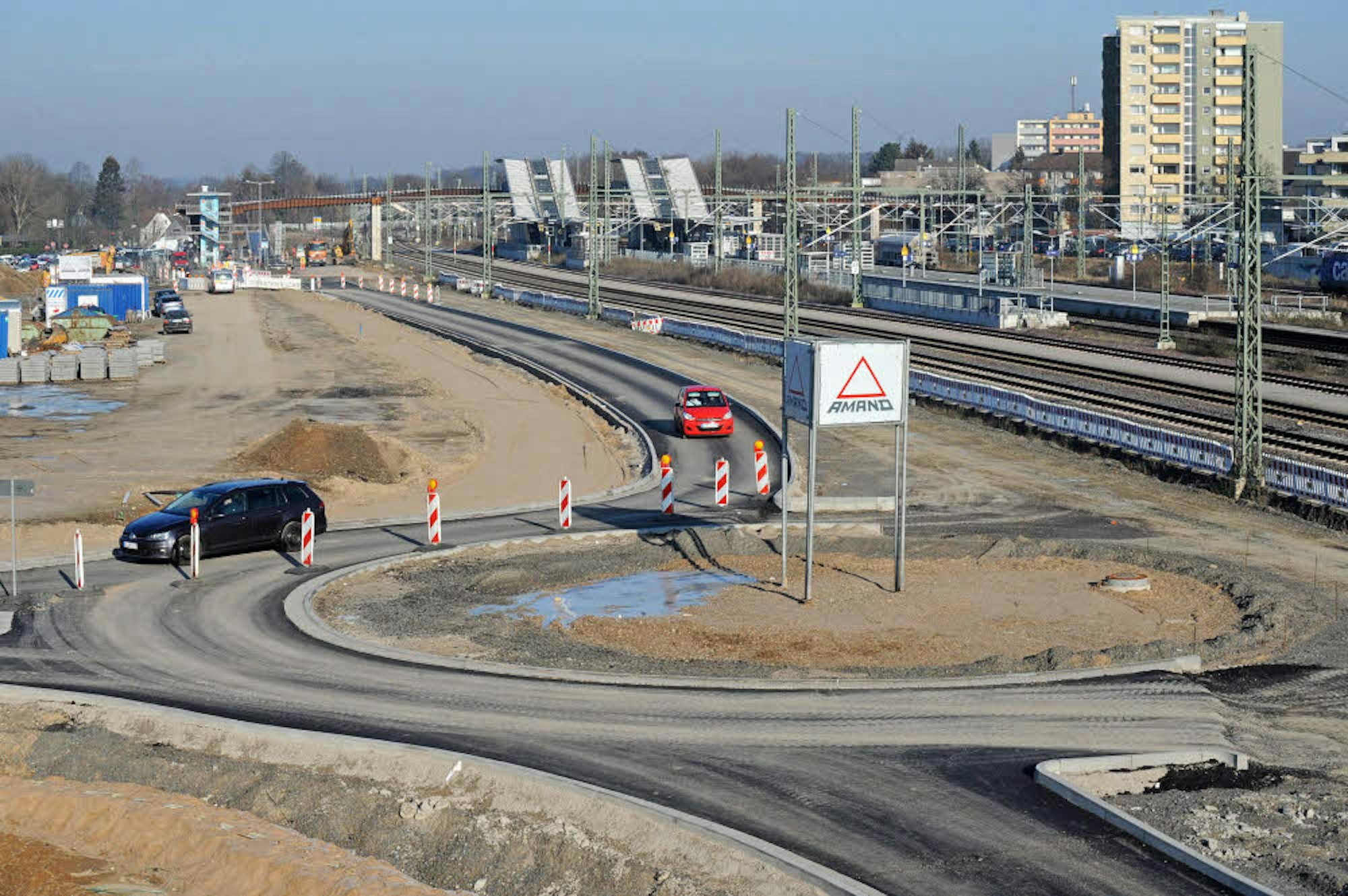 Auf ungewohntem Terrain liegt jetzt die Ausfahrt von der Bahnhofsbrücke her. Sie führt über ein erstes Stück Europa-Allee und einen halbfertigen Kreisel zurück zur Bahnallee.