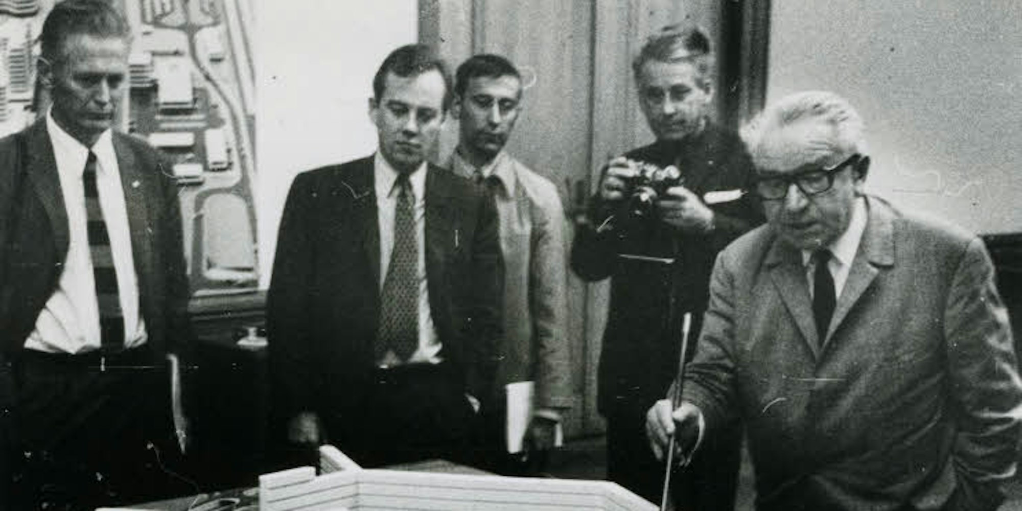 Architekten betrachten mit dem Planungsamtsleiter Paul Grantz (r.) das Modell des Lindwurms. Manche waren bereit, für die Wohnmaschine die gesamte Kolonie II abzubrechen.