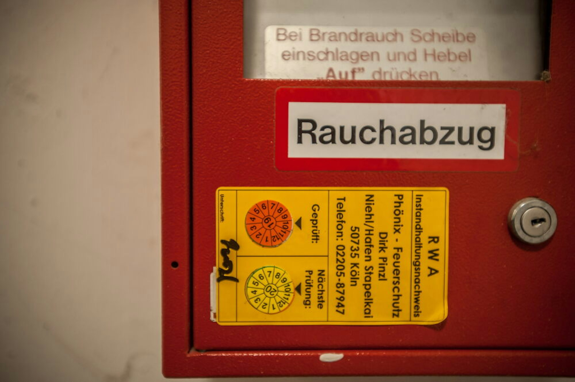 Die jährliche Prüfung des Rauchabzugs im Treppenhaus ist seit einem Jahr überfällig, verrät das Prüfsiegel von 2019.