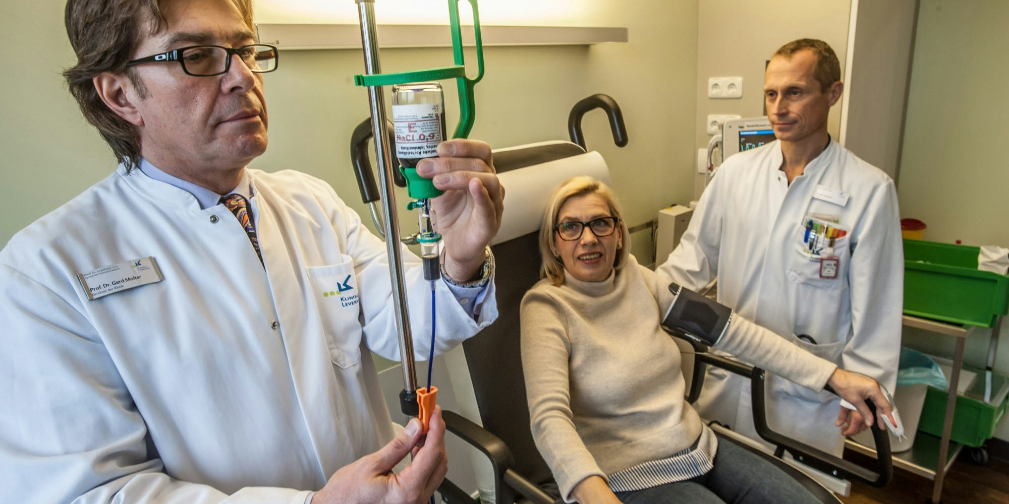 Daher hat sich das Klinikum Leverkusen seit Beginn dieses Jahres dem Projekt „Patient-Blood-Management“ (PBM) angeschlossen. Seit 2011 wird das auf drei Säulen basierende Behandlungskonzept von der Weltgesundheitsorganisation empfohlen. In Deutschland startete das Netzwerk an der Uniklinik Frankfurt sowie in Bonn, Münster und Köln. Das Leverkusener Haus ist eines von sieben bundesweit, das nun nach den empfohlenen Qualitätsstandards des PBM behandelt. „Etwas, das uns ein wenig stolz macht“, versichert Professor Dr. Gerd Molter, Direktor der Klinik für Anästhesie und operative Intensivmedizin. So werden Patienten mit einer begründeten Anämie (Blutarmut), wenn der Vorlauf es zulässt, in ein Vorsorgeprogramm aufgenommen, bei dem mittels eines Medikaments die Eigenblutproduktion vor einer Operation deutlich erhöht wird. Diese Patienten haben die Chance, auch große Eingriffe ohne eine Fremdbluttransfusion zu überstehen.