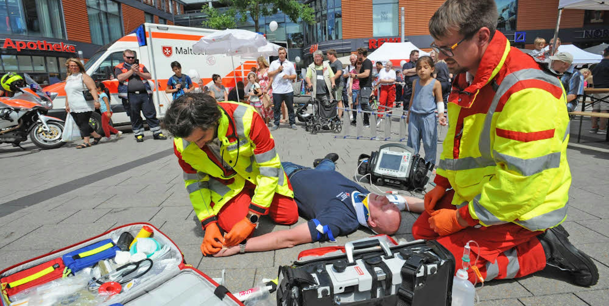 Leverkusen – Am Samstagmittag brennt die Sonne vom Himmel. Das Rettungsdienst-Rot leuchtet mit ihr um die Wette. Vor dem Rathaus steht bereits ein Rettungswagen, ein zweiter naht mit Blaulicht und Sirene heran. Die Sanitäter springen heraus und laufen zu einem Mann, der in der Mitte des Platzes in der Wiesdorfer Fußgängerzone unter einer Leiter begraben liegt.