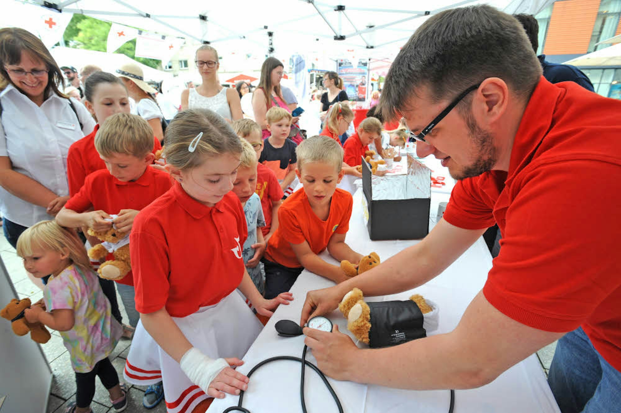 Unter einem weißen Pavillon konnten an diesem Tag sogar die Kleinsten mit anpacken: In der Teddybärenklinik wurden Kuscheltiere untersucht, zum Blutdruckmessen komplett von der Manschette umhüllt, und durch eine Röntgenbox aus Alufolie geschickt. Schließlich bekamen die Kinder den Bären mit verbundenem Arm oder Beinchen mit nach Hause und dürfen sich um den Patienten kümmern.