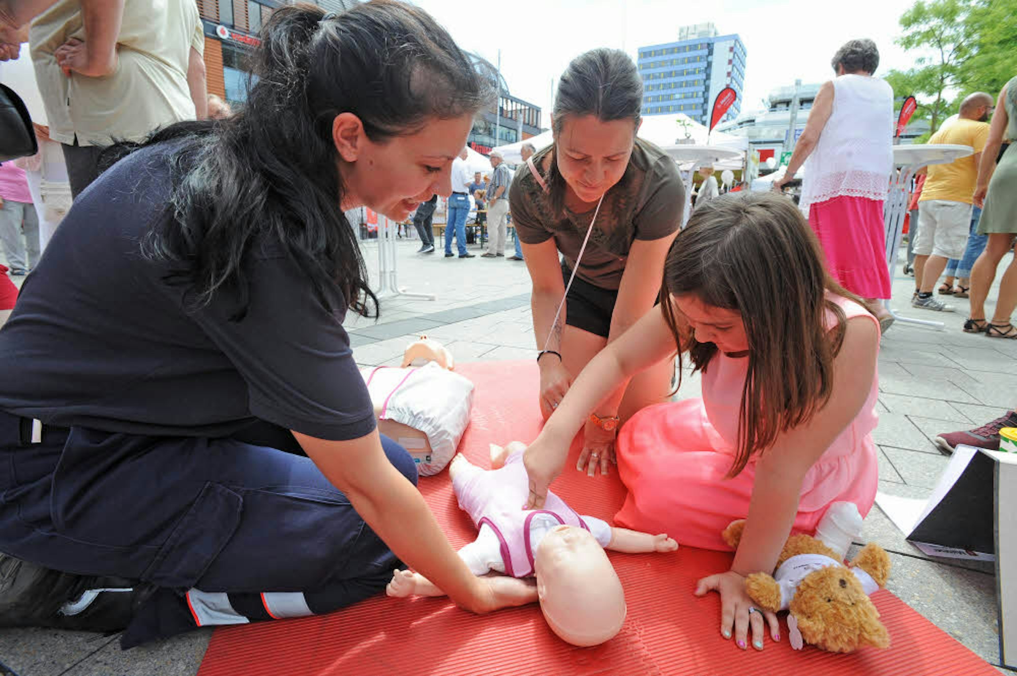Stefanie Kampa von den Maltesern (links) zeigte Daniela Alznauer und Tochter Hanna, wie man Erste Hilfe bei Säuglingen leistet.