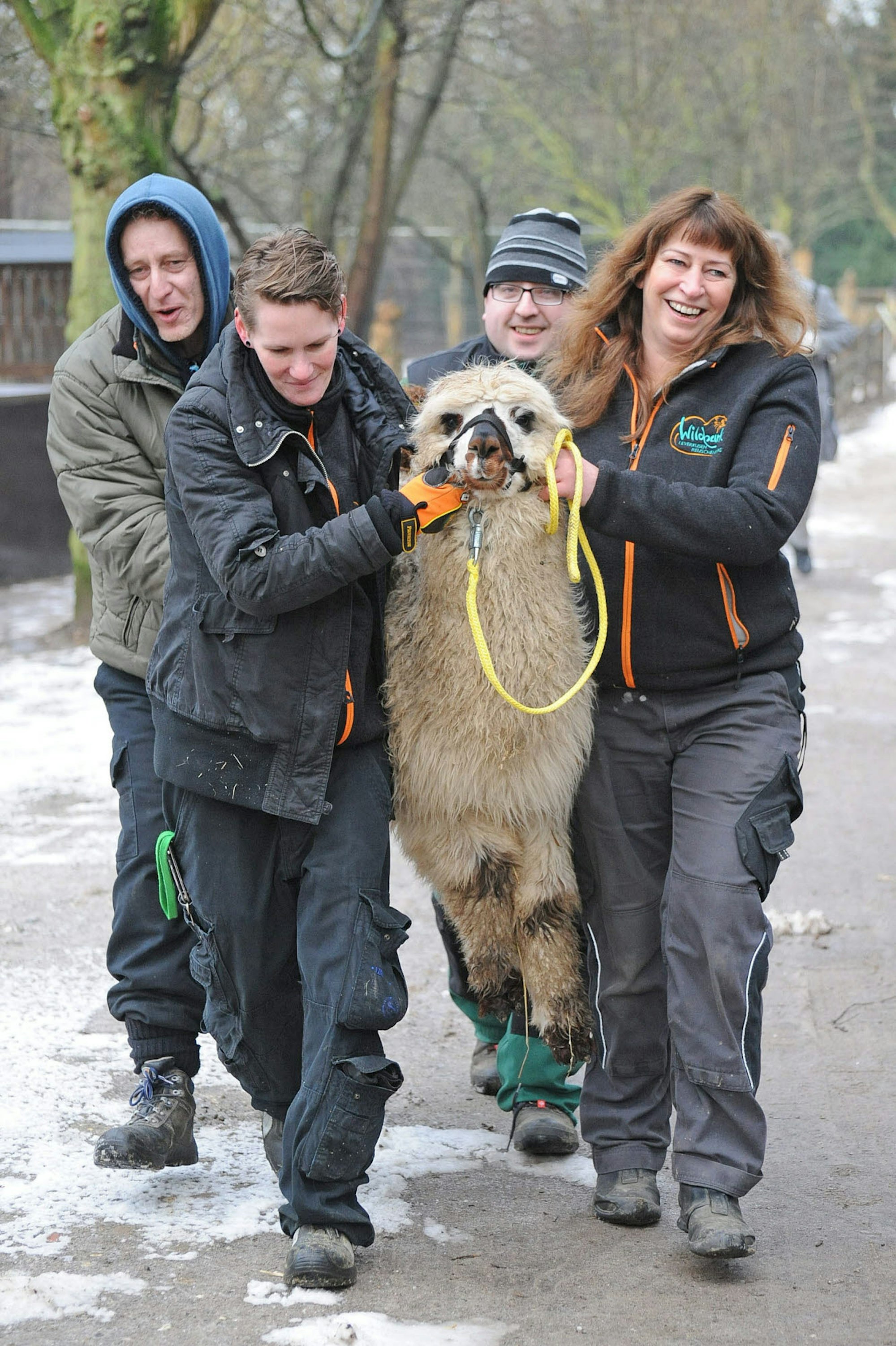 Und so zogen am Freitagmittag Vilja, Janna, Walttraut, Mira, Vanessa, Brinco und Fienchen - so heißen die sieben Reuschenberger Alpakas - nicht wie von Parkleiterin Sabine Honnef geplant in einer „Kamelkarawane“ selbst um, sondern wurde einzeln zu ihrer neuen Unterkunft getragen oder gefahren - je nach Gewicht.