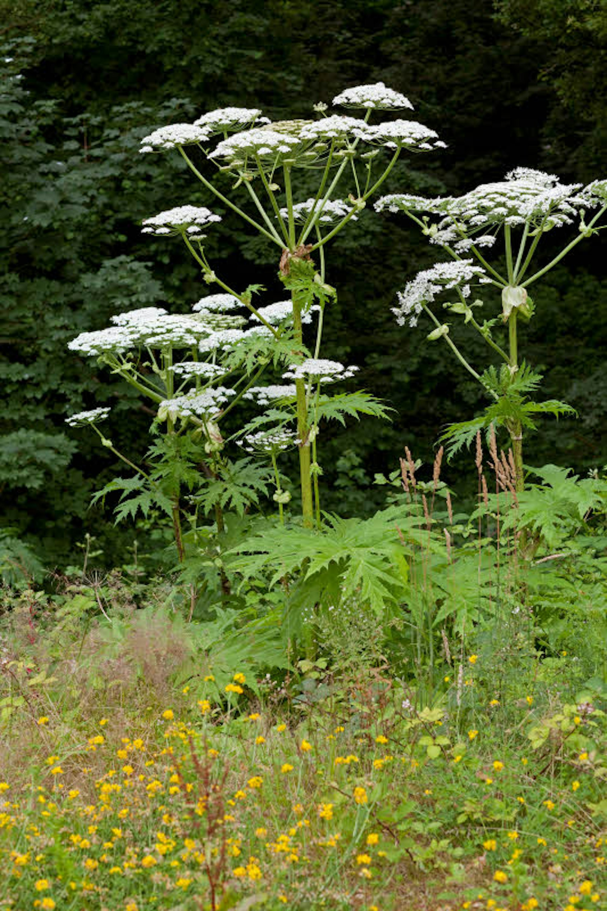 1 Riesen-Bärenklau: Diese große krautige Pflanze stammt aus dem Kaukasus. Der Riesen-Bärenklau zieht zwar blütensuchende Insekten an, stellt aber in Siedlungsnähe ein akutes Problem dar: Hautkontakt mit der Pflanze kann schmerzhafte und schlecht heilende Blasen verursachen.
