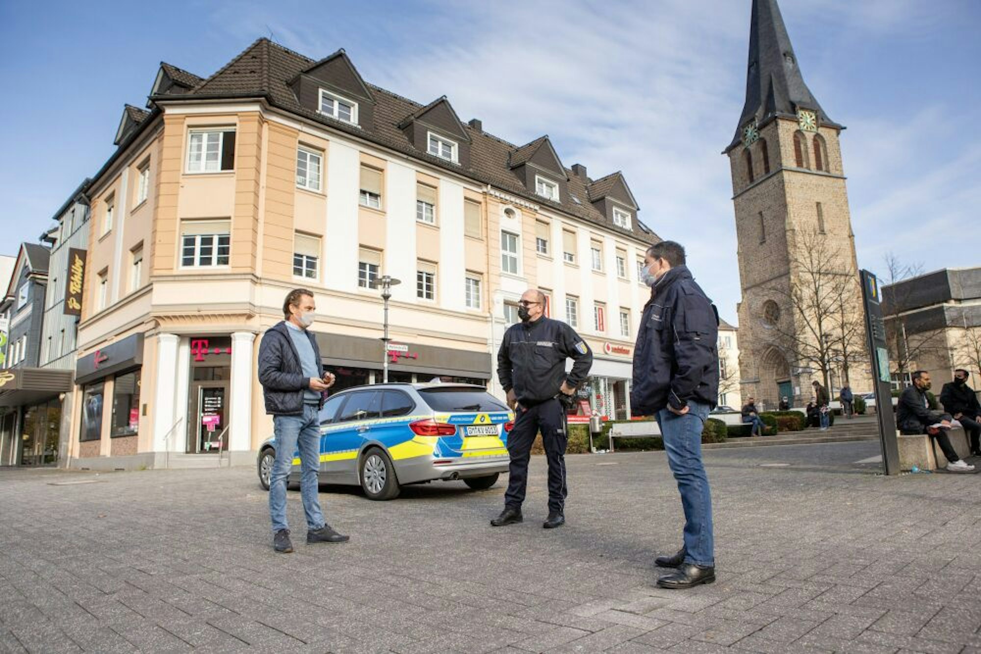 Mit Abstand nutzt Guido Richardt die Gelegenheit, um Oliver Orth und Frank Helmenstein vom Gummersbacher Ordnungsamt nach der Maskenpflicht zu fragen.