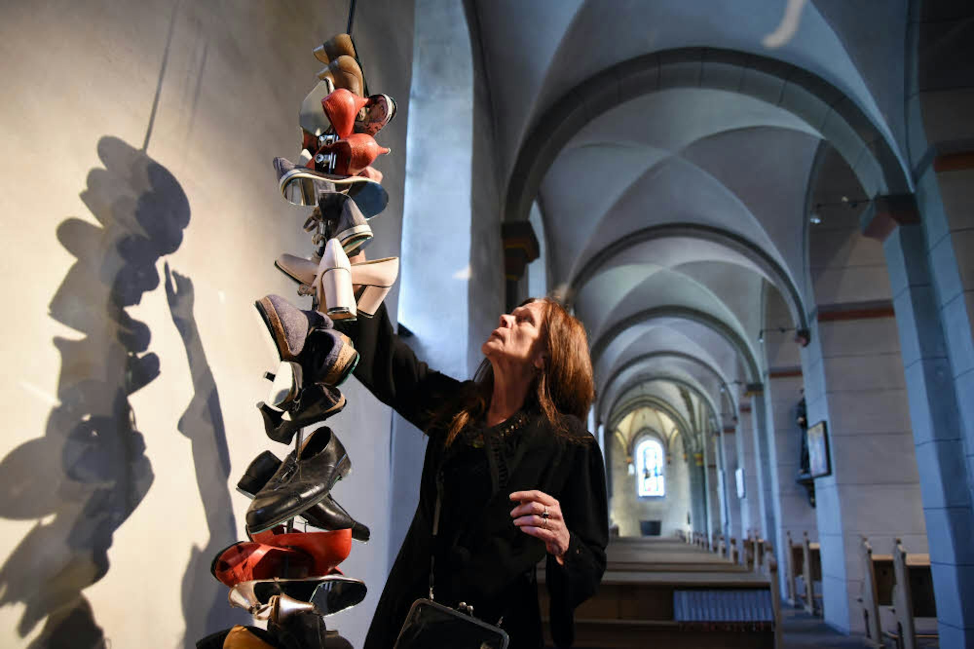 Ein Kunstwerk aus Schuhen mit gläserner Sohlen war eines der Werke, die Maria Schätzmüller-Lukas in St. Nikolaus zeigte.