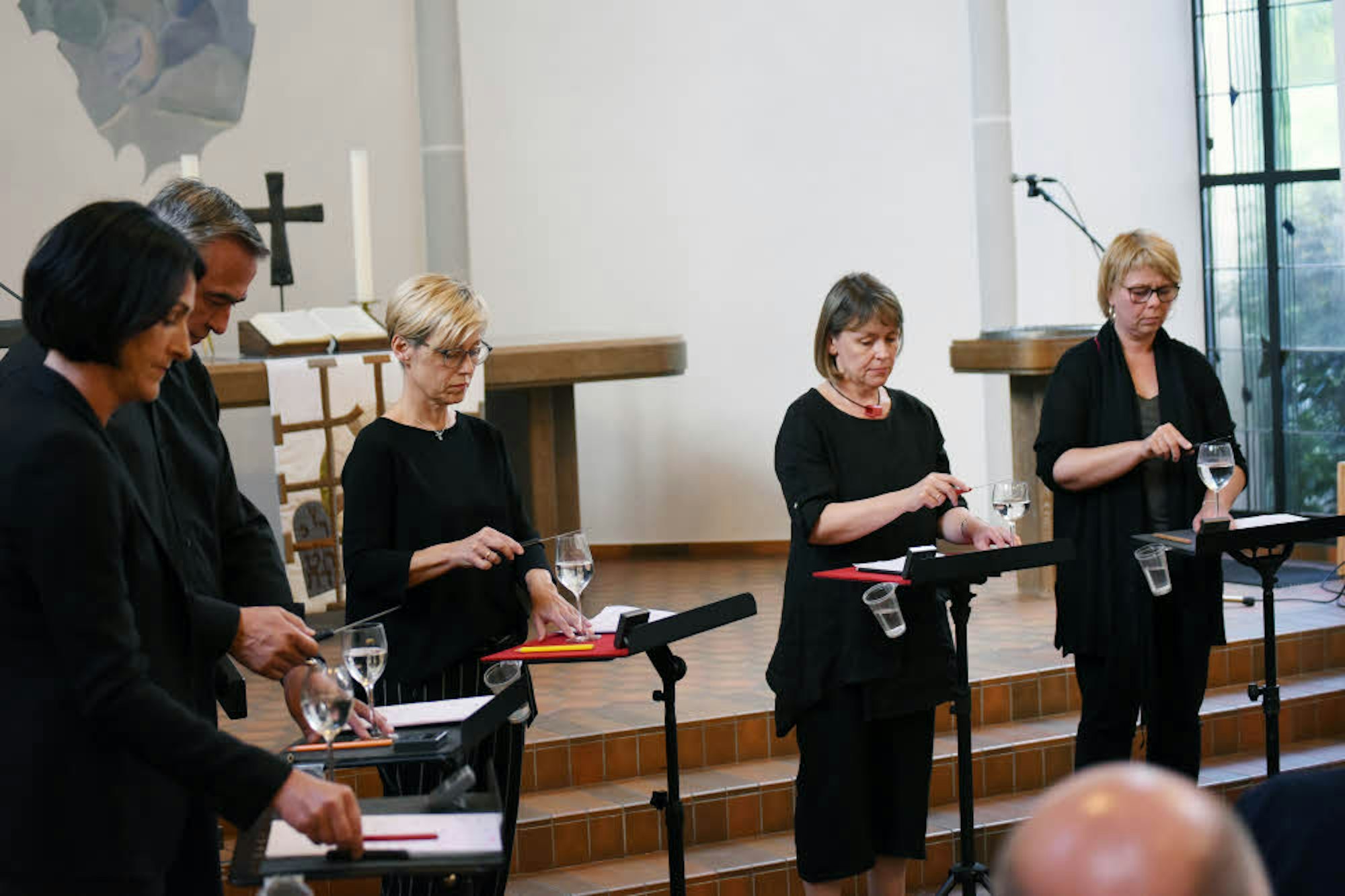 Dabei wird eine „konzentrierte Stille“ erzeugt, die von den Künstlern umrahmt ist durch vorsichtig geschlagene oder bestrichene Klänge sowie rotierende Fingerbewegungen auf den Rand der Weingläser. Begleitet werden die sehr leise beginnenden und sich langsam aufbauenden Klänge sowie bisweilen dynamischen Klangsphären von der Solistin Heike Gorny, die mit der Flöte akzentuierte Zwischentöne platziert: Die Stille als eine musikalische Intonation des „Nichts“ bereicherte die Zuhörer in der Kirche als eine perfekt inszenierte Komposition.