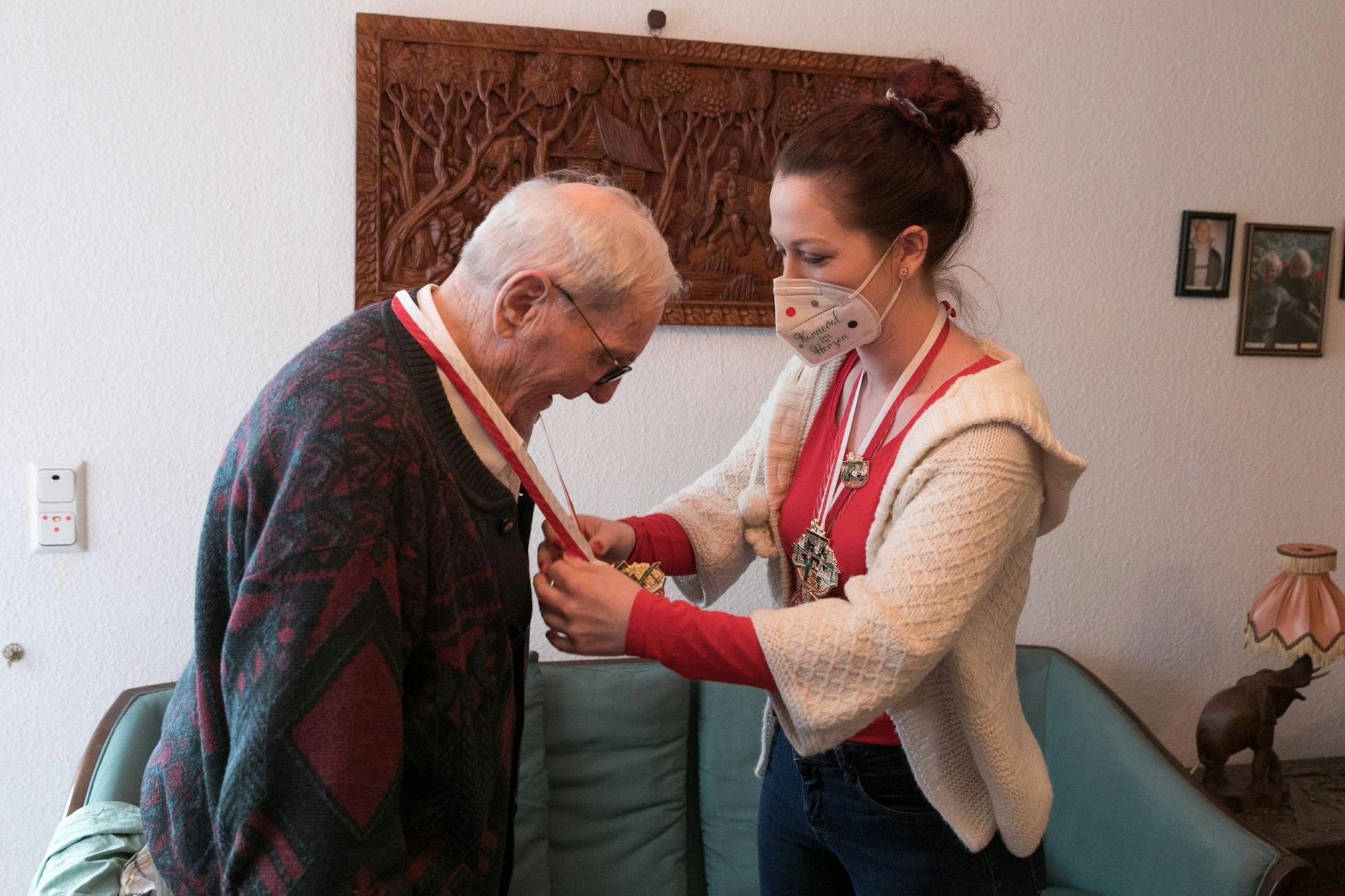 So war es auch 1962, als Hermann Meinerzhagen auf der Karnevalsbühne der KG Närrische Oberberg stand. Allerdings nicht einfach so, sondern als waschechter Karnevalsprinz. Zu seinem 60-jährigen Prinzenjubiläum hat der Senior deshalb den Karnevalsorden der KG überreicht bekommen, den Judith Schwenk überreichte.