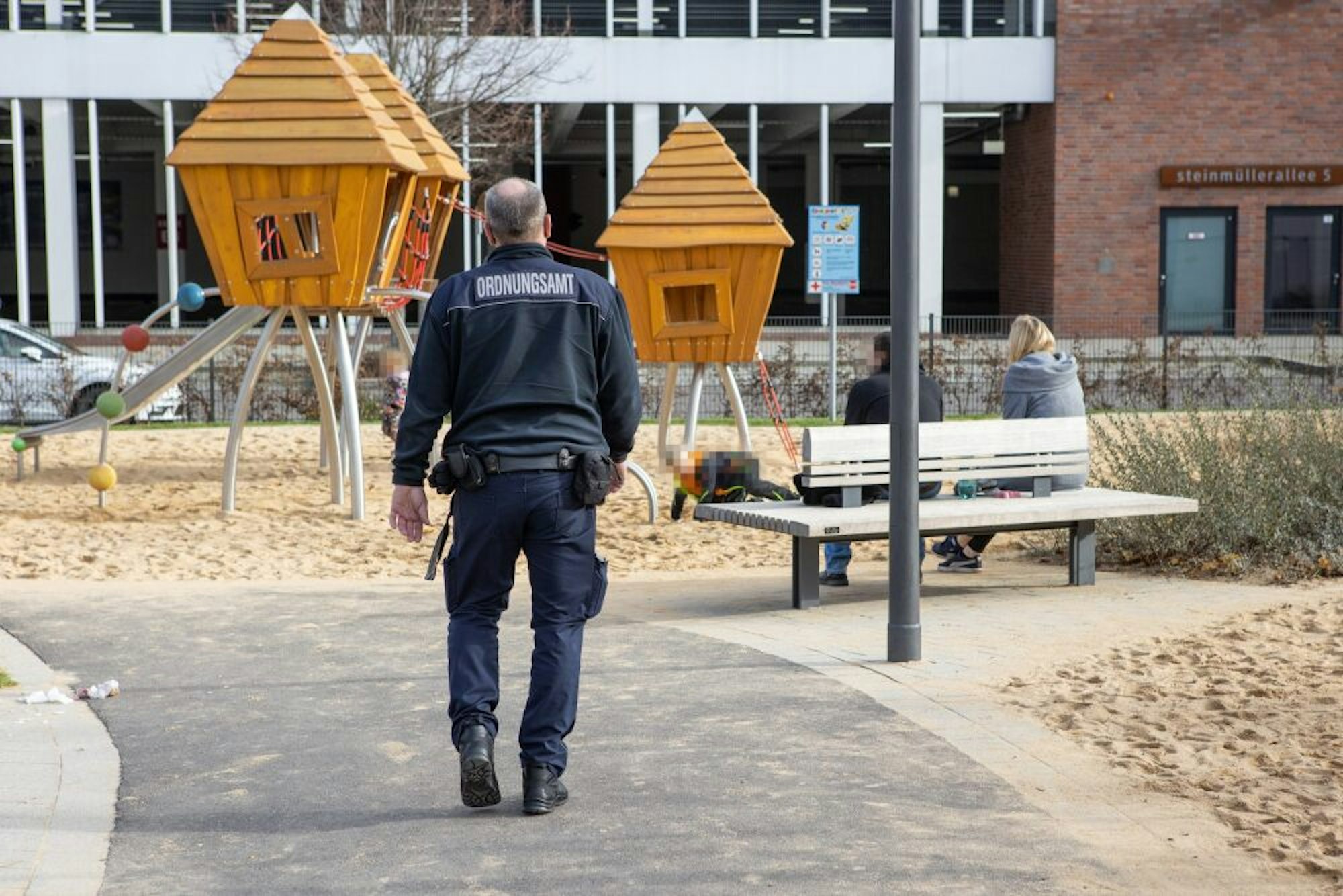 Am Lindenplatz trifft das Duo dann auf die Kaffeetrinker, Orth belässt es bei freundlichen Ermahnungen, obwohl er dort 250 Euro wegen des Verstoßes gegen das Kontaktverbot kassieren könnte. „Ich lasse einmal mit mir reden, auch ein zweites, aber kein drittes Mal“, beschreibt er seine Grenzen. Zu Fuß geht es dann über die Kampstraße zum Steinmüllergelände und auf den neuen Spielplatz am Stadtgarten. Orth: „Kinder dürfen hier die Maske abstreifen, die Großen müssen sie tragen.“ Und prompt gibt’s Arbeit für die Ordnungskraft: Keiner der Erwachsenen hat den Schutz angelegt. „Die Grenze ist die Rasenkante“, erklärt Rathau