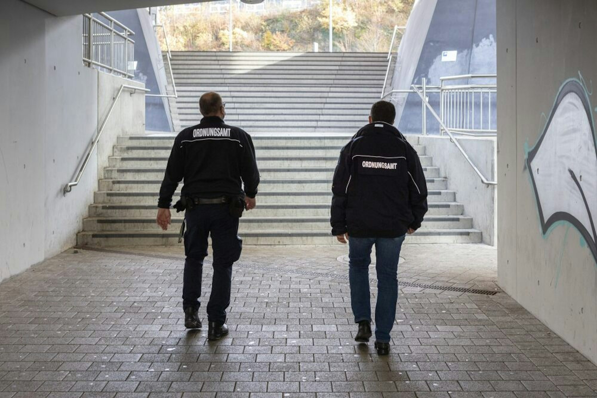Oliver Orth und Frank Helmenstein vom Gummersbacher Ordnungsamt kontrollieren auf dem Steinmüllergelände.