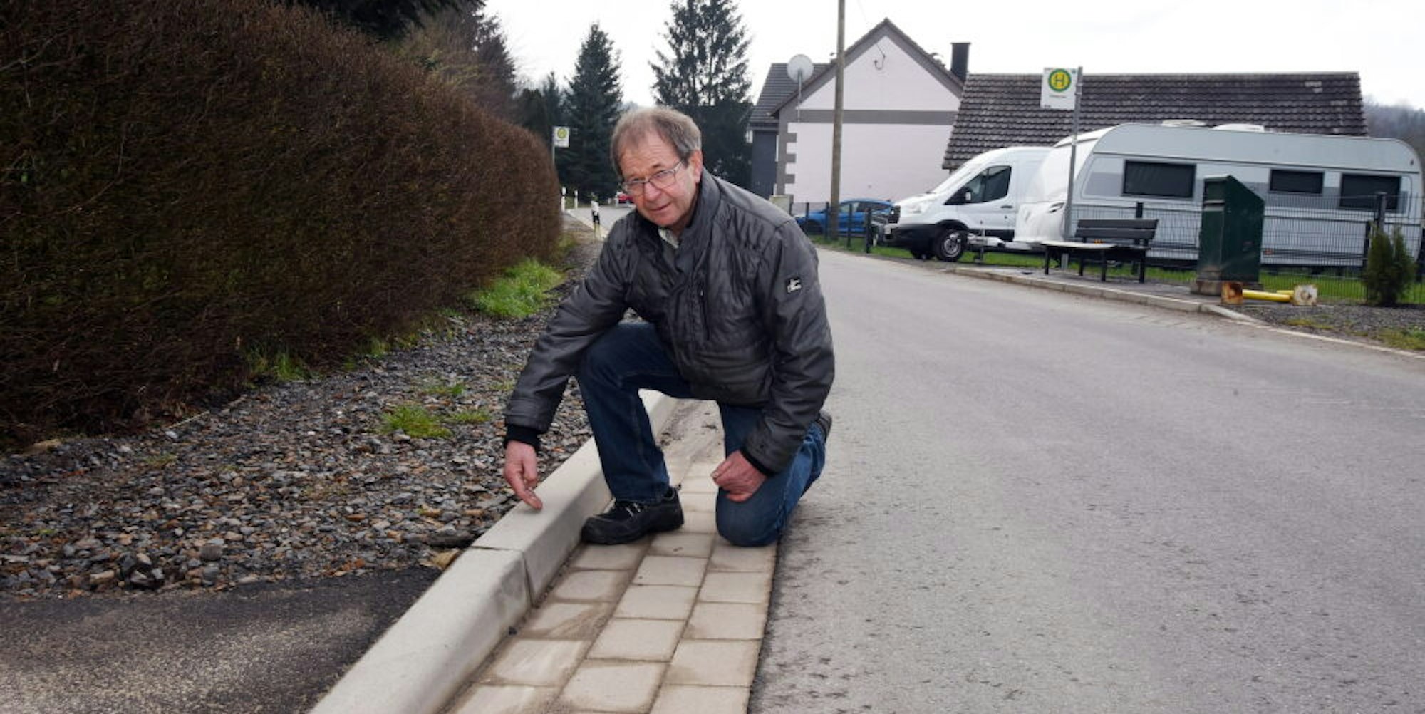 Die eckigen Bordsteine sind für Anwohner Klaus Kürten ein Ärgernis nach der Sanierung der Landstraße 129.