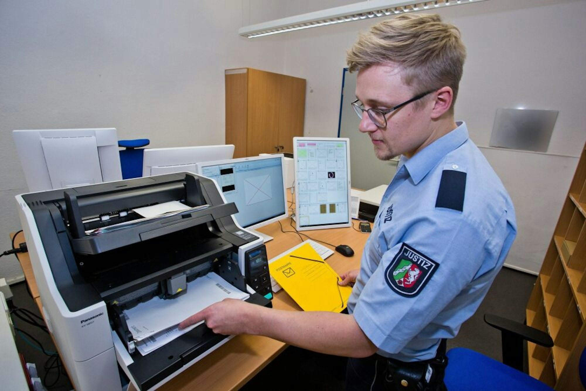 Die Waldbröler Wachtmeister bedienen die Hochleistungsscanner, falls Dokumente auf Papier eintreffen.
