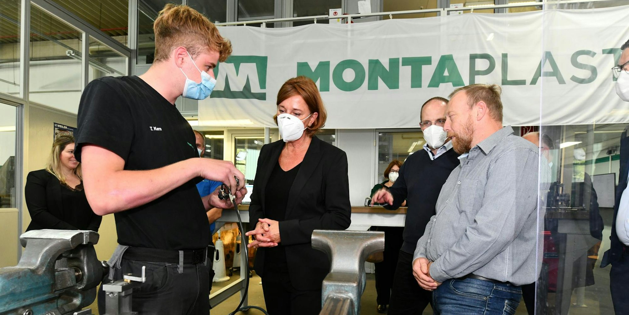 Dass sie ihre zweite Visite im Südkreis innerhalb von zwei Tagen trotzdem abbrechen musste, noch ehe die Powerpoint-Präsentation zur betrieblichen Ausbildung bei Montaplast gezeigt werden konnte, lag schlicht an den vielen Gesprächen, die bis dahin schon geführt worden waren. Es ging um die weltweite Autoproduktion, um Corona, Umsatzentwicklung, Azubi-Aufenthalte in den USA, stockende Halbleiterlieferung, E-Autos und, und, und.