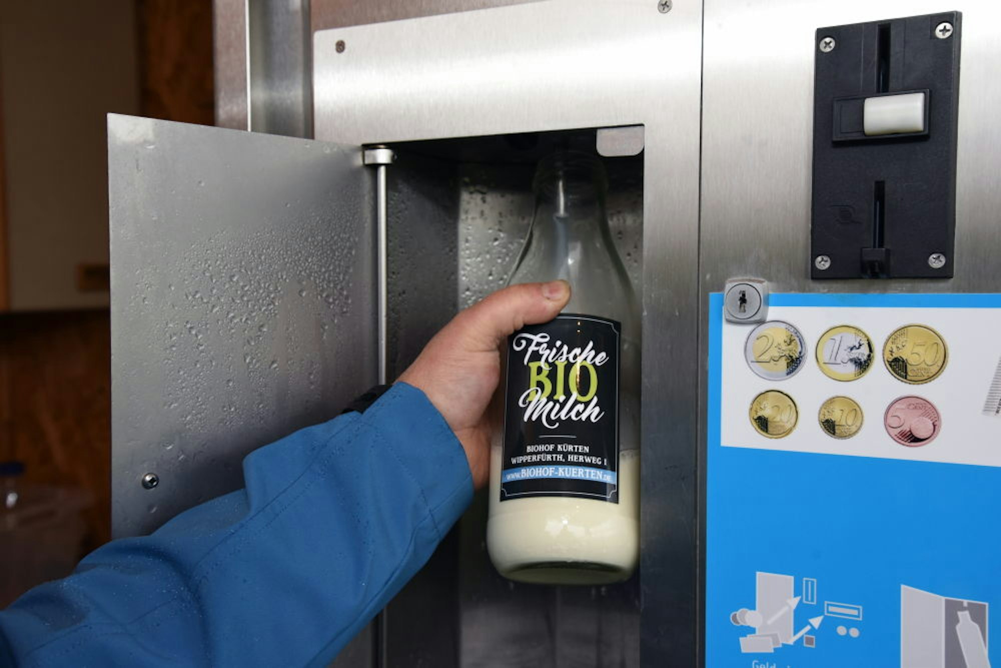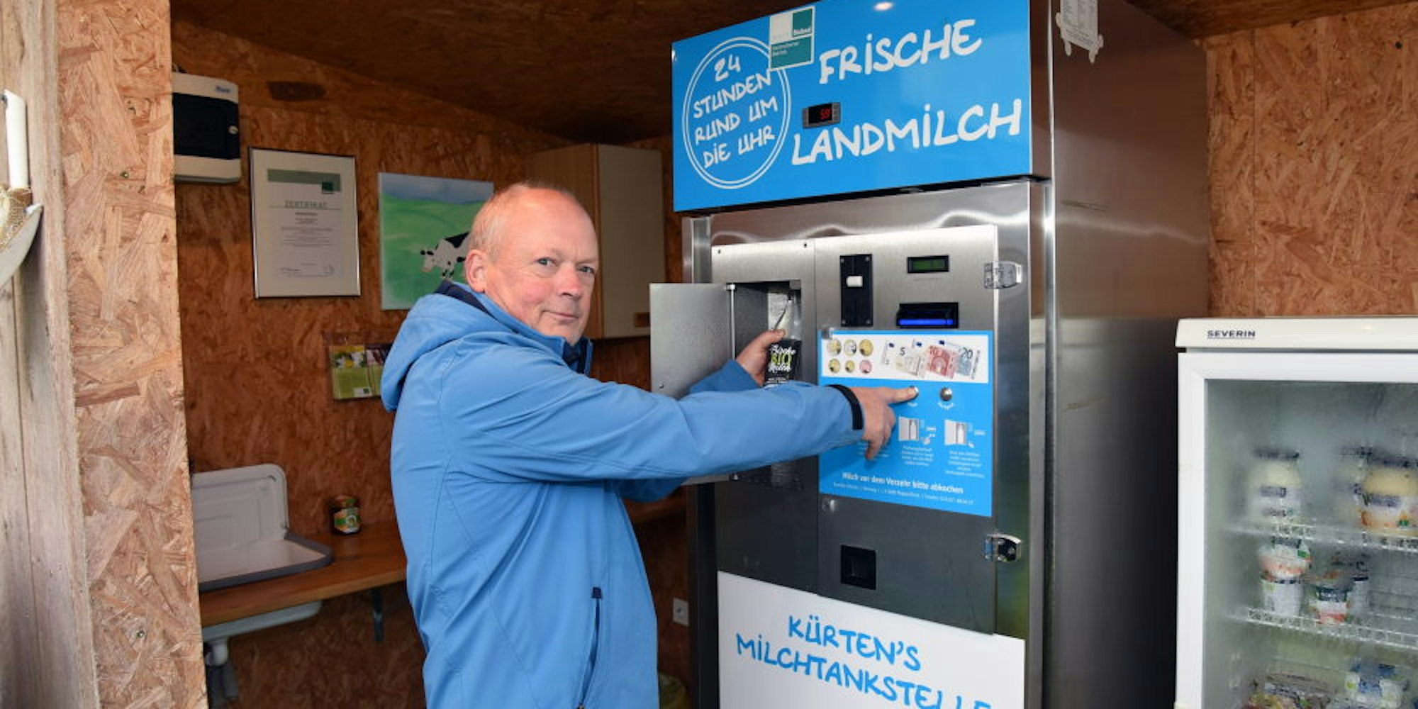 Die Idee hatte Landwirt Manfred Kürten, der auf anderen Bauernhöfen in der Gegend auf dieses System aufmerksam geworden und selbst schnell überzeugt war. „Die Nachbarn haben sich auch vorher schon Milch aus den großen Tanks bei uns geholt, aber das war immer mit viel Aufwand verbunden“, sagt der Landwirt. Dank der Milchtankstelle sei der Milchverkauf nun einfacher, denn wer möchte, kann sich die Milch ohne Hilfe abzapfen – und zwar rund um die Uhr. „Manche kommen tatsächlich nachts vorbei, nach ihrer Spätschicht, oder ganz früh morgens vor der Arbeit“, berichtet Sohn Christian Kürten.