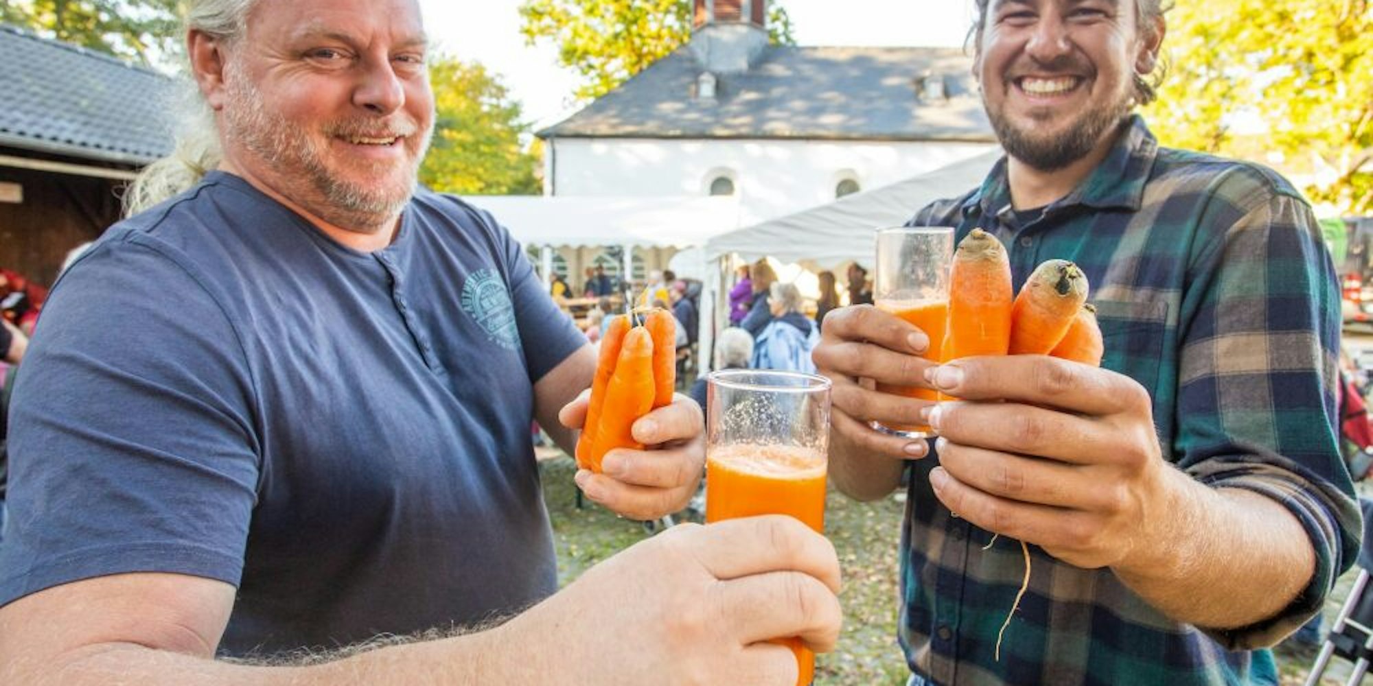 Ein Prosit auf die Ernte mit frisch gepresstem Möhrensaft: Solawi-Sprecher Tim Vehlewald (r.) mit Vize Jörg Höfer-Kopka.
