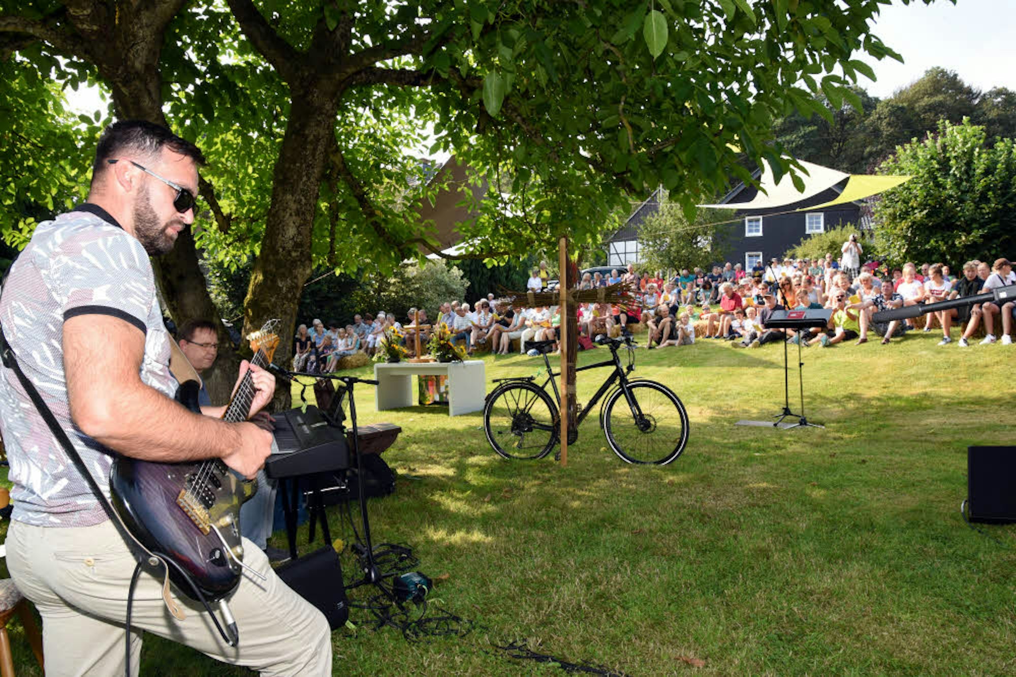 Auch die rund 250 Gläubigen, die sich zum Fahrrad-Gottesdienst einfanden, hatten größtenteils ihr Rad dabei. Die evangelische Allianz Waldbröl hatte dazu eingeladen. Pfarrer Jochen Gran begrüßte die Menschen, die auf Bänken, Heuballen oder auf der Wiese Platz genommen hatten, im „Amphi-Theater von Hahn“. Tatsächlich erinnerte die abschüssige Wiese unweit des Hahner Dorfplatzes ein bisschen an antike Veranstaltungsorte – und ganz wie die alten Römer hatte die Dorfgemeinschaft Hahn Sonnensegel als Schattenspender für die Anwesenden aufgezogen.