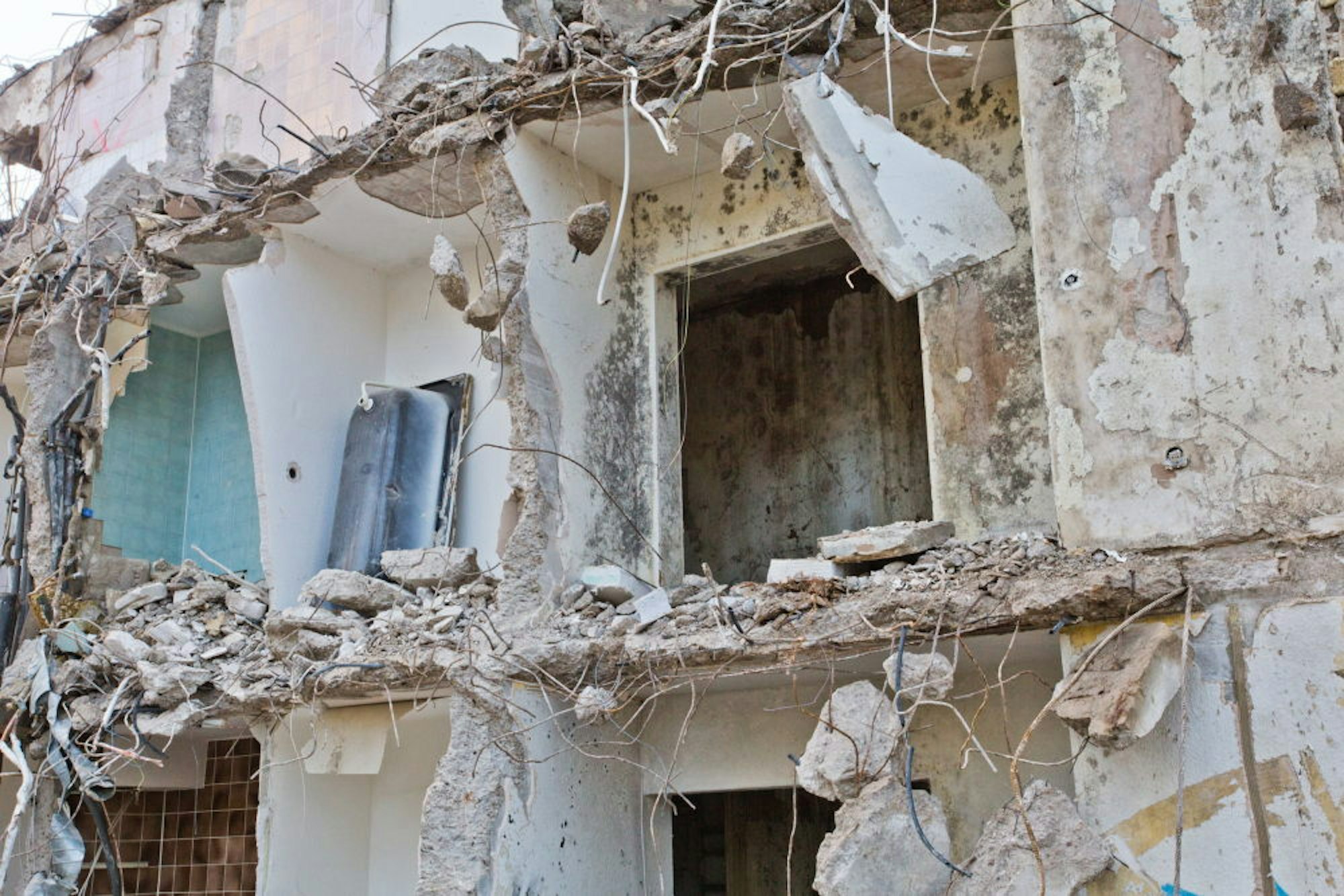 Denn: In spätestens zwei Wochen greift ein 80 Tonnen schwerer Bagger von oben an. „Damit erreichen wir eine Höhe von maximal 32 Metern und brechen von oben ab“, sagt Sachs. 27 Meter misst die Merkur-Brache zurzeit an ihrer höchsten Stelle. Und wird der Schutt dort nicht gebraucht, so soll er erneut auf Belastungen überprüft werden. „Danach könnte er eventuell im Straßenbau zum Einsatz kommen“, überlegt Fachmann Peikert und verspricht, dass kein Merkur-Klumpen in den geplanten neuen Immobilien weiterlebt. Auf der Baustelle wundert er sich, wie wenig Moniereisen in den Wohnungen verbaut worden ist: „Heute findet man davon viel mehr in den Wänden.“