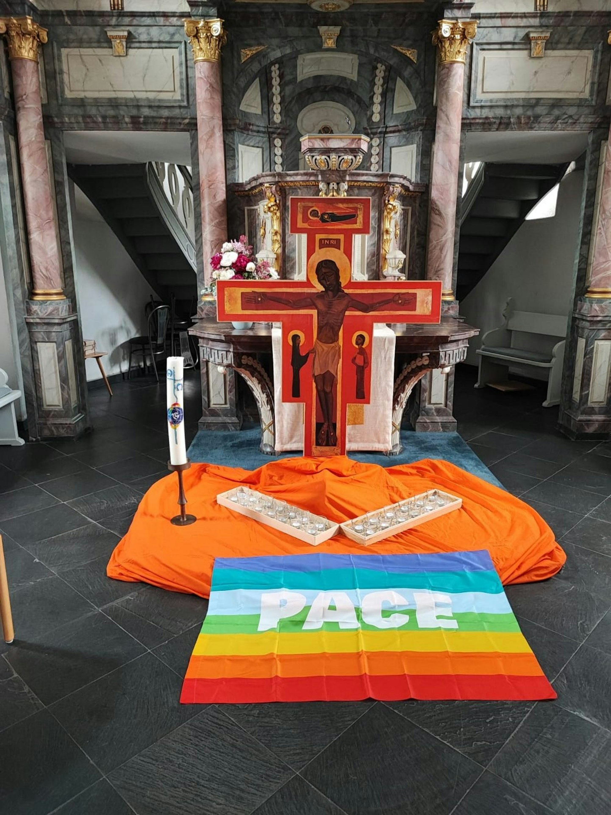 Die Bedeutung von Abendmahl und Kommunion zum Beispiel, da unterscheiden sich evangelische und katholische Kirche. Probleme, die sich in Bergneustadt selten stellten, ergänzt Taphorn und lobt ausdrücklich die Unterstützung durch Kreisdechant Christoph Bersch und durch den Pfarrer der Bergneustädter Altstadtkirche, Dietrich Schüttler. Dort wird einmal im Monat zum Taizé-Gebet vor dem Altar eine sogenannte Mitte aufgebaut: Das von Taphorn selbst gezimmerte Taizé-Kreuz, eine ökumenische Kerze mit Friedenstaube – anfangs wurde das Gebet noch Friedensgebet genannt – ein orangefarbenes Tuch. Rundum stehen Stühle.