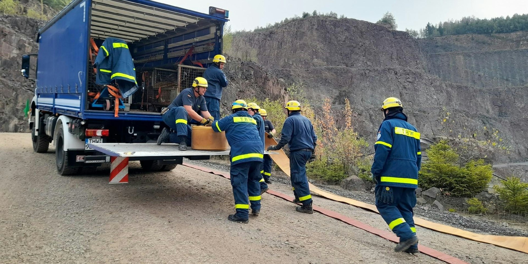 Die Bergneustädter hatten sich für die Übung einen Steinbruch nahe Drolshagen ausgeguckt. Dessen Grundwasser förderten die Frauen und Männer über 45 Höhenmeter in ein Ablaufbecken. Dabei leistete eine der eingesetzten Pumpen allein 15 000 Liter, füllten also rund 120 Badewannen – pro Minute. Vor allem sei es bei der Übung auch um das Kennenlernen der Ausrüstung und das Üben wichtiger Handgriffe gegangen, berichtet Maike Retat-Amin vom NRW-Landesverband des Technischen Hilfswerks. „Die passenden Schläuche wiegen schließlich schon im trockenen Zustand um die 85 Kilogramm.“