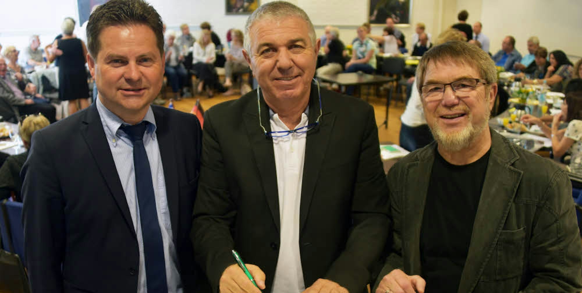 Ins Goldene Buch der Stadt trug sich gestern Shalom Kazir (Mitte) ein. Der Besuch aus Israel wurde von Bürgermeister Ulrich Stücker (l.) und Gerhard Hermann begrüßt.