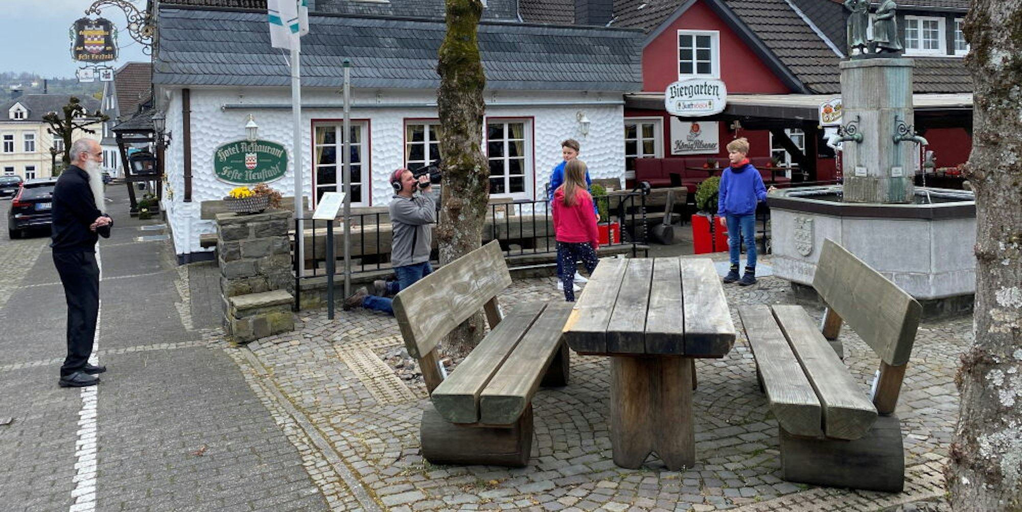 Gedreht wurde – natürlich – in der Altstadt, wo drei Kinder auf der Suche nach der Stadtgeburtstagsfeier sind. Mehr will Walter Jordan noch nicht verraten, nur so viel noch: Gefilmt wurden die einzelnen Programmpunkte auf der Bühne im Jägerhof – stilecht vor der Bergneustadtfahne und der Wäscheleine mit ollen Liebetötern als Dekoration. Von der Bühne aus werden auch die beiden Nyestädter Originale Karl von der Dörspe und Minchen die Zuschauer mit einem herzlichen „Leiwe Niijestätter, chunn Daach tesaamen!“ begrüßen, um dann wie weiland die Waschweiber am Losemundbrunnen auf Platt die dreckige Wäsche der Stadt und der Stadtoberen ausbreiten.