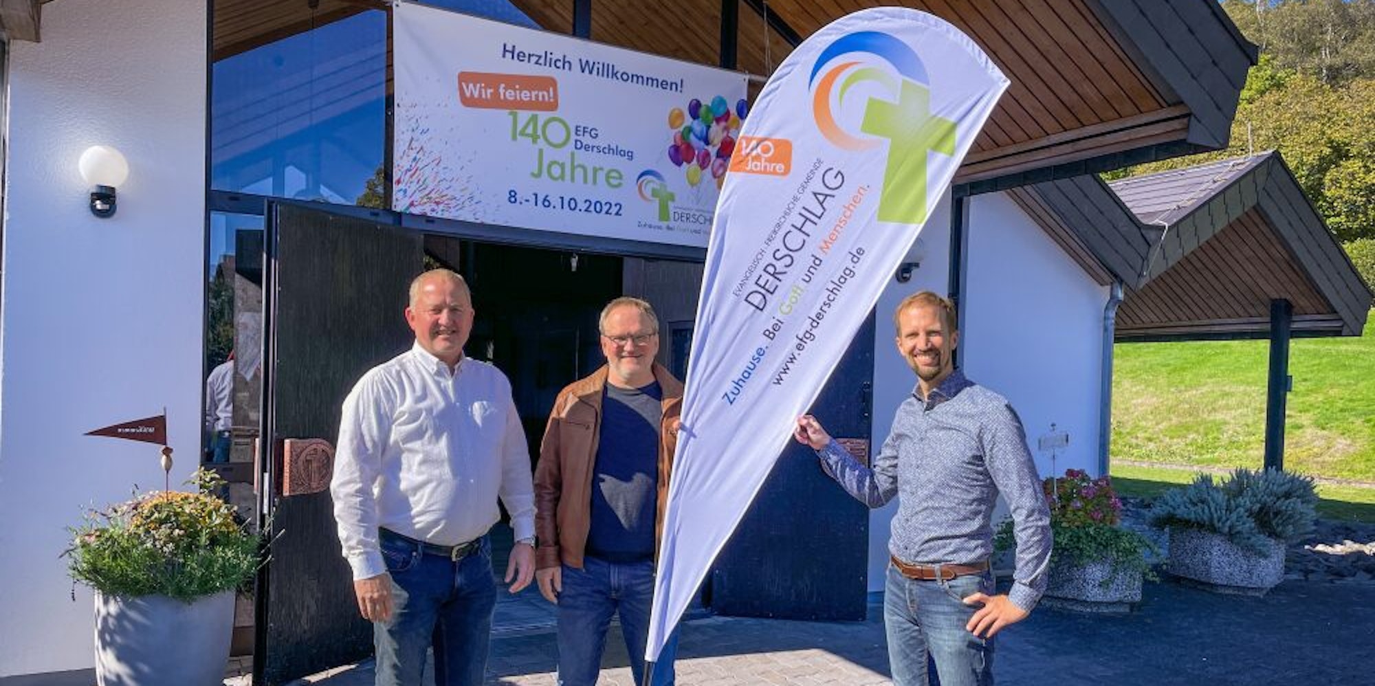 Zum Mitfeiern laden (v.l.) die Gemeindeleiter Thomas Brück und Matthias Hornischer sowie Pastor Dr. Peter von Knorre ein.