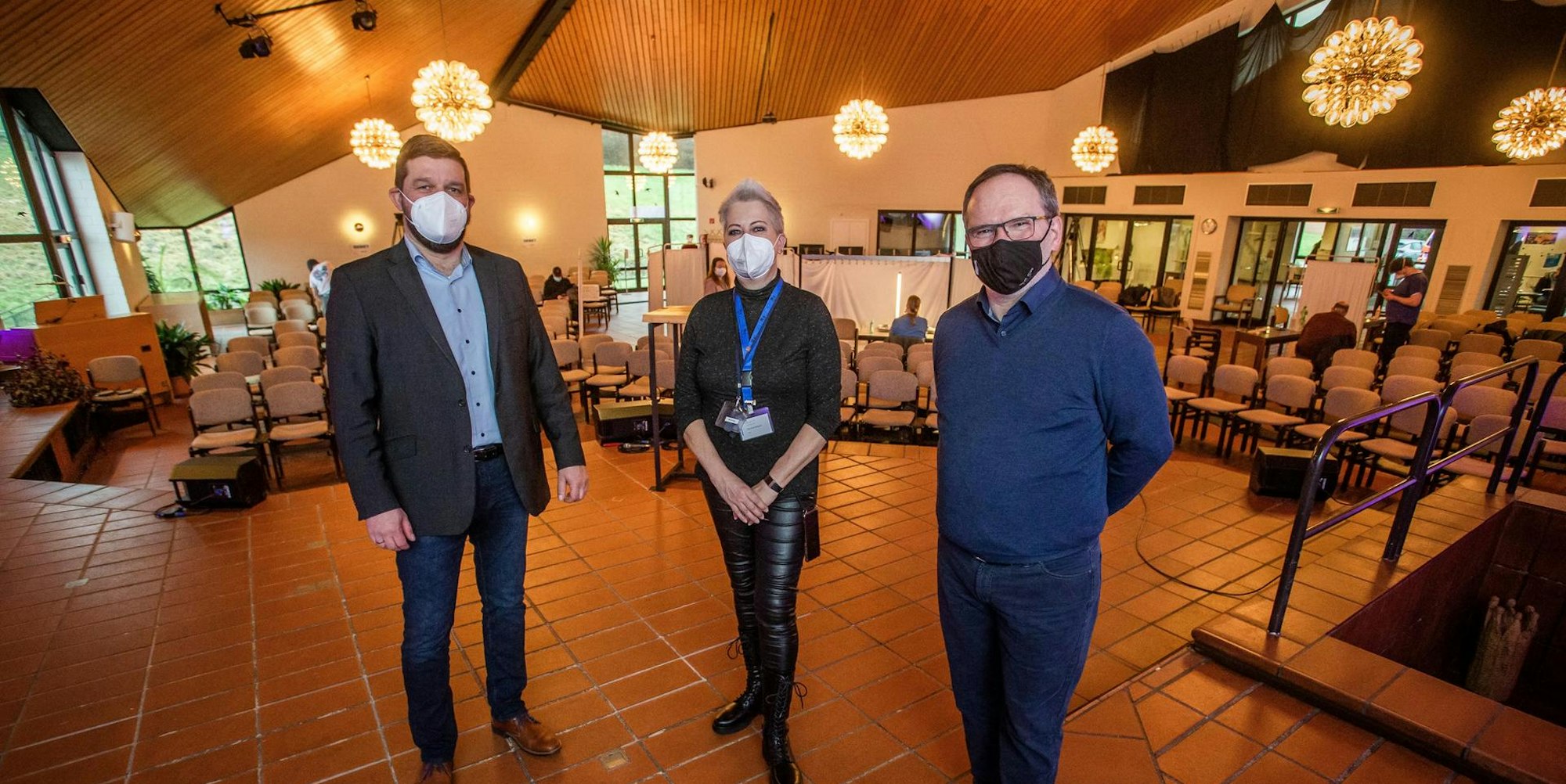 Gemeindeleiter Matthias Hornischer (r.) begrüßte Dezernent Felix Ammann und Impfkoordinatorin Martina Bilstein.