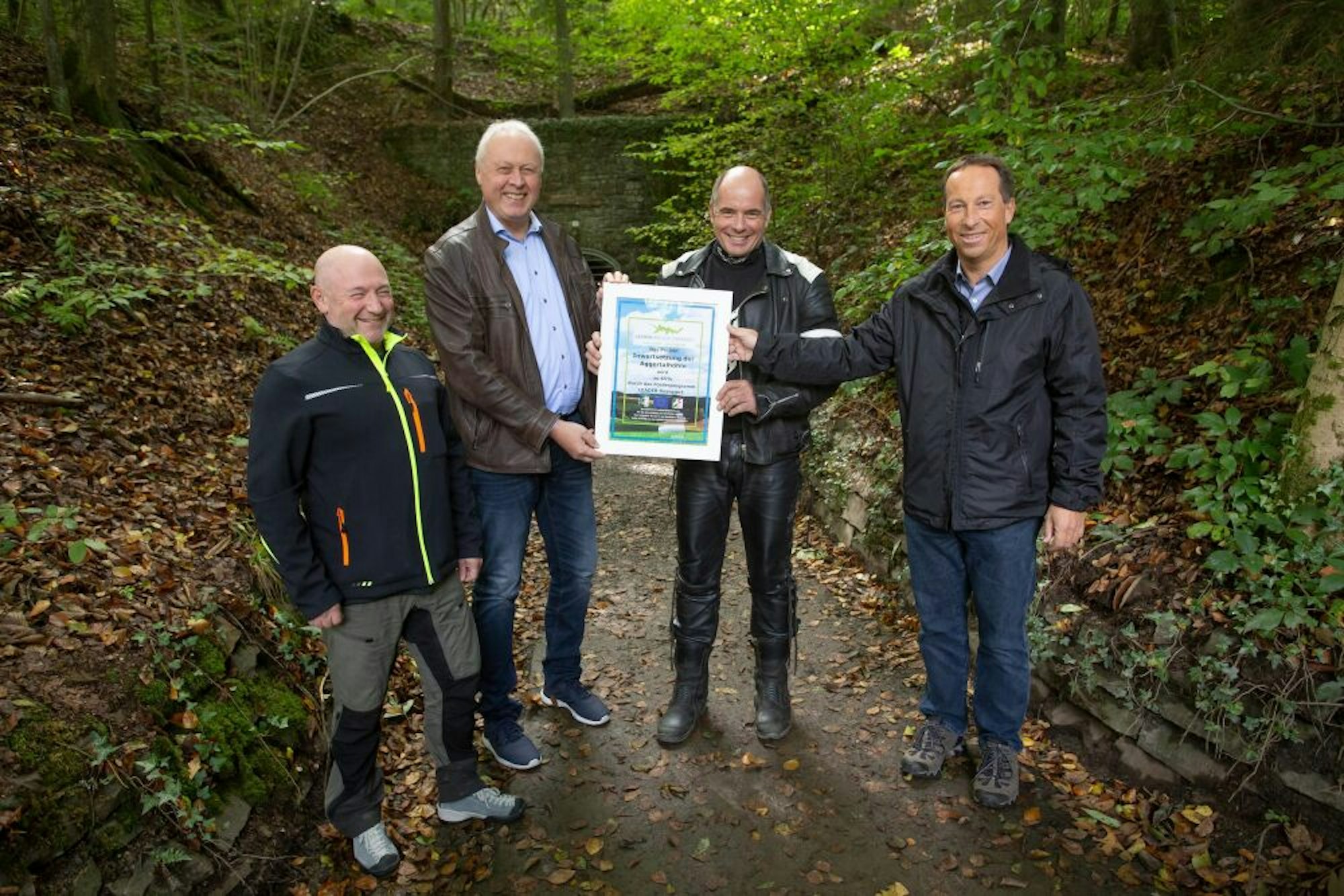 „Licht-Mann“ Alexander Chrapko, Dr. Gero Karthaus, Höhlenforscher Stefan Voigt und Dezernent Frank Herhaus mit der Leader-Urkunde.
