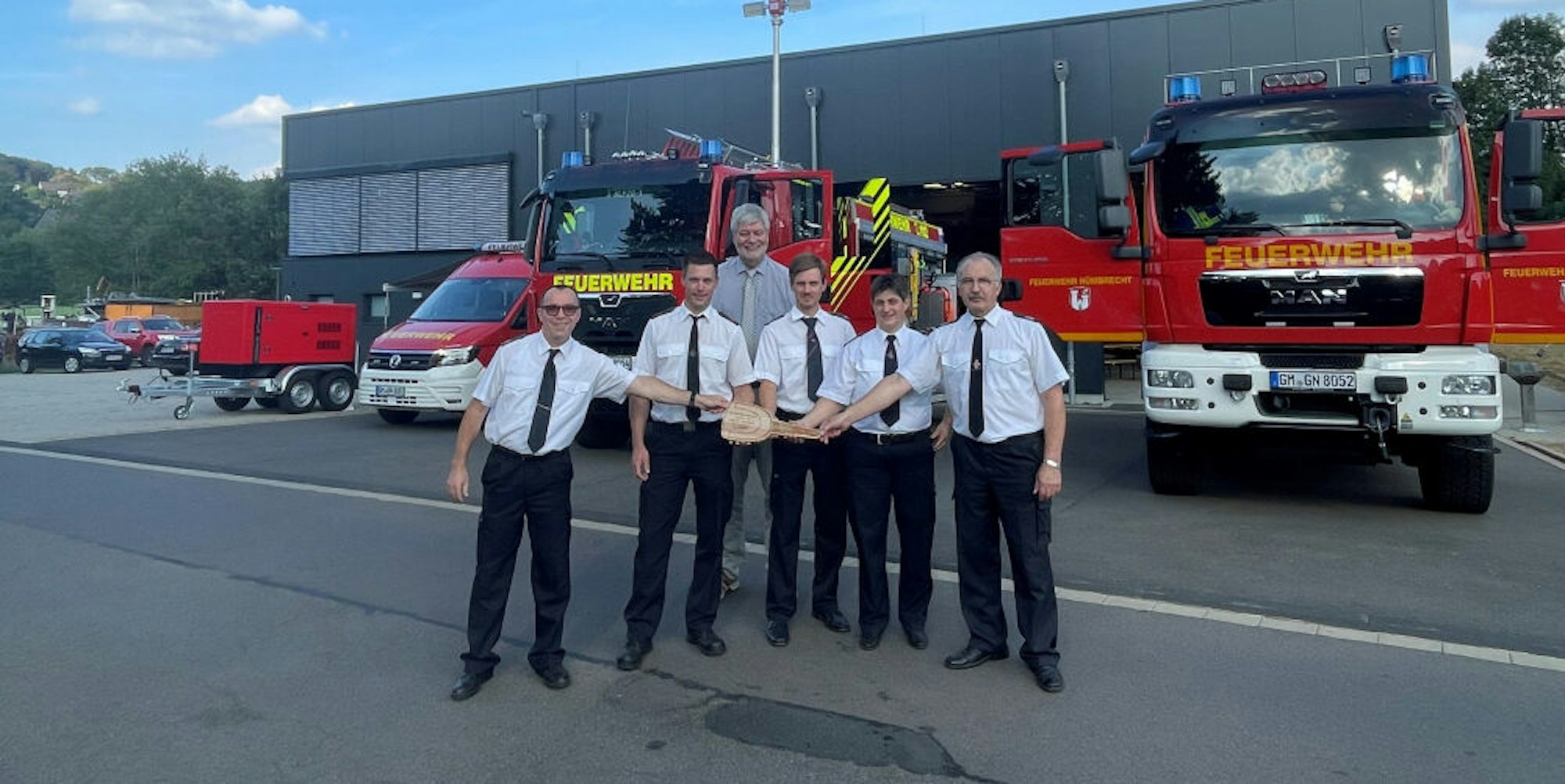Ab sofort ergänzen ein Hilfeleistungslöschgruppenfahrzeug (HLF 20), ein Gerätewagen Technische Hilfe (GW-TH) und ein Einsatzleitfahrzeug (ELW) den Fuhrpark der Einheiten. In Arbeitsgruppen hatten die Mitglieder die Einrichtung der Fahrzeuge selbst geplant, sodass diese auf dem neuesten Stand im Bereich Technik und Ausstattung sind. „Wenn ein Mensch aufgrund fehlender oder mangelhafter Ausrüstung zu Schaden käme, könnte ich mir das selbst nicht verzeihen“, sagte der Bürgermeister, als er den symbolischen Schlüssel an Feuerwehrchef Udo Müller überreichte.