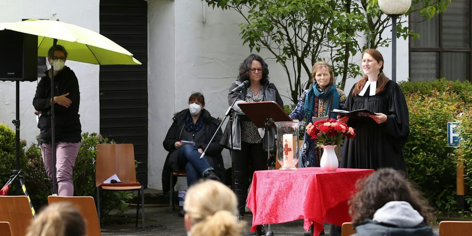 Ausdrücklich hatte die Gemeinde vorher angekündigt, der Gottesdienst finde auch bei schlechtem Wetter draußen statt, zum Glück aber hörte der Dauerregen eine Stunde vorher auf. Und als Pfarrerin Alexandra Pook die Gemeinde begrüßte, lugte sogar die Sonne für ein paar Augenblicke durch die Wolken. Endlich könne man wieder Gottesdienst feiern, sagte Pook. Die Predigt hielt Gemeindereferentin Sigrid Marx, die an Pfingsten erinnerte als das Fest der vielfachen Glaubenssprachen, mit denen die frohe Botschaft Gottes möglichst weit verbreitet werden solle.