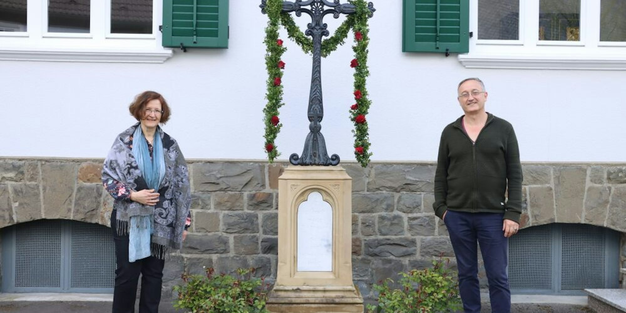 Kreuzweihe in Holpe: Gemeindereferentin Karin Thomas und Johannes Klüser am geschmückten Wegekreuz.