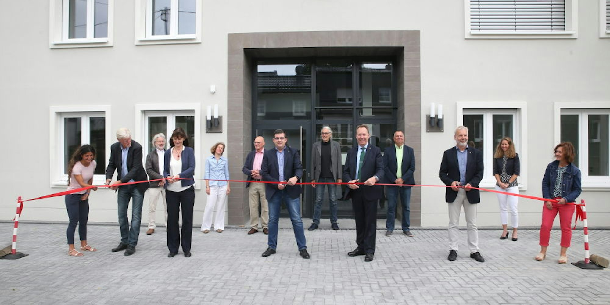 Pionierprojekt: Dilan Kut, Bernd Baßfeld, Anette Gelfarth, Frank Helmenstein, Jochen Hagt, Dirk Panske und Sandra Nowack (v.l.) am roten Band. Die Tagespflege von Uwe Söhnchen (u.l.) und die Sprachtherapiepraxis (u.r.) legen als erste los.