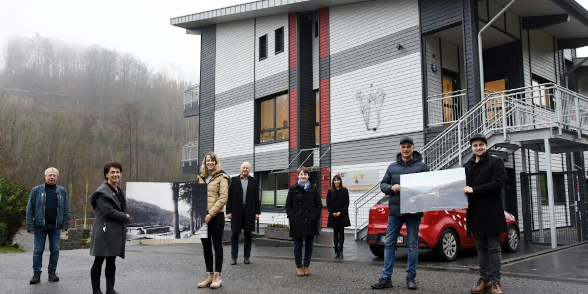 Das Gebäude wurde in Holzrahmenbauweise errichtet, erklärten Ralf und Tim Rother, die als Einweihungsgeschenk an Britta Arnold und ihre Stellvertreterin Laura Lorkowski zwei große, mehr als 100 Jahre alte Fotos von dem Gelände an der Leppe mitgebracht hatten, auf dem heute die Kita „Farbenpracht“ steht.