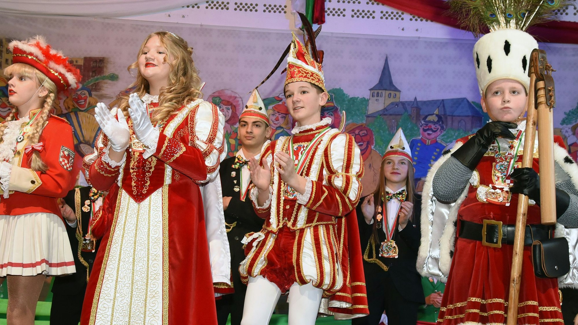 Und mit dem Einzug des neuen Dreigestirns galt der Applaus ganz den neuen Tollitäten: Prinz Jakob I., Prinzessin Maya sowie Bauer Louis geben sich die Ehre und der ganze Saal steht kopp. Auch Bürgermeister Lukas Miebach ist voller Freude und folgt der Tradition mit der Übergabe des Zepters an den Prinzen Louis zur offiziellen Proklamation des Kinder-Dreigestirns. „Hallo liebe Jung-Karnevalisten, es ist so toll, euch in diesem Jahr als Dreigestirn zu begrüßen, und dass ihr für die Session die Verantwortung übernehmt“, ruft der erste Bürger der Gemeinde ins Mikro.