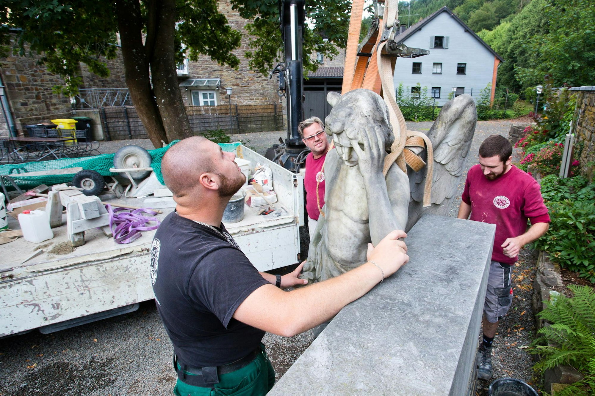 Engelskirchen – Frank Strässer atmet durch. Die Arbeit ist getan, die Flügel haben nicht mal einen Kratzer abbekommen. Hätte anders ausgehen können, denn: „Gerät ein Zugseil zu stark unter Spannung, könnte es den Flügel brechen.“ Soeben haben Strässer und seine Kollegen eine gut 200 Kilogramm schwere und etwa 1,60 Meter hohe Engelsstatue auf ihren neuen Platz gewuchtet: Der ist im Engelgarten des Engelskirchener Engel-Museums. Und mit solchen Kunstwerken kennt sich Strässer aus: Er stellt Grabsteine her und bearbeitet sie auch. „Aber eine solche Aufgabe ist dann doch eher ungewöhnlich“, sagt er.