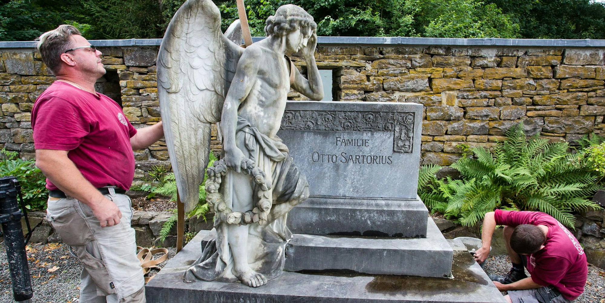 Das wiederum erfuhr das Engelskirchener Ehepaar Haude: Auftraggeber Otto Sartorius ist nämlich der Urgroßvater von Maja Haude. 1918, wenige Wochen nach dem Ende des Ersten Weltkriegs, trauerte er um seinen gerade mal 18 Jahre alten Sohn Willy, der gefallen war. „Wahrscheinlich in der Schlacht von Verdun“, schildert Ralf Rother. Er ist Vorsitzender des Engelvereins, der das schmucke Museum am Engels-Platz hütet. „Dass dieses Grabmal nicht verschwindet, sondern weiterhin an das Schicksal des jungen Mannes erinnert, das ist etwas ganz Besonderes“, sagt Rother, während die Strässer-Mitarbeiter Filip Strässer und Sergej Wirch letzte Fugen am Sockel der Statue glätten.