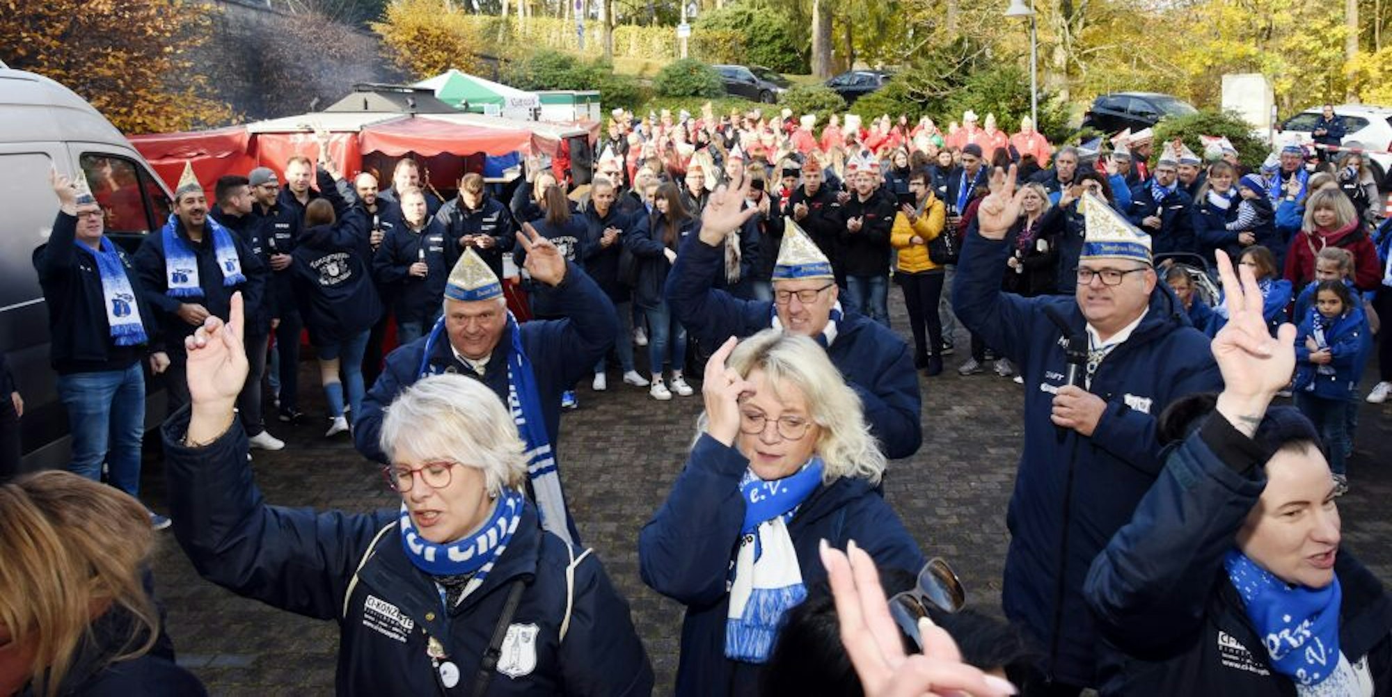 Weil das Virus vor dem Festplatz bleiben sollte, musste jeder Besucher eine Schleuse passieren, seinen 3G-Status nachweisen und zudem seine Anwesenheit protokollieren. Auf diesem Wege einigermaßen abgesichert, trat das immer noch aktuelle Dreigestirn mit Prinz Andreas Lenger, Bauer Ralf Becher und Jungfrau Andrée „Motzi“ Motzkus befreit auf und schmetterte einige seiner Hits, die es schon für seine erste Session 2019/2020 eingesungen hatte. Ihr neues Motto lautet: „Bei uns fällt die Session nicht aus, wir machen stets das beste draus.“ An neuen Tollitäten mangele es dem Verein keineswegs, erklärte KVB-Sprecherin Susanne Wurth: Für die Sessionen im nächsten und übernächsten Jahr stünden schon Kandidaten bereit. Die aber wollten nicht vorziehen und damit riskieren, in einer von Corona beeinträchtigten Session 2021/2022 zu regieren. Wenn nichts dazwischen kommt, kann sich der 416 Mitglieder starke KVB auf einige Sitzungen freuen.