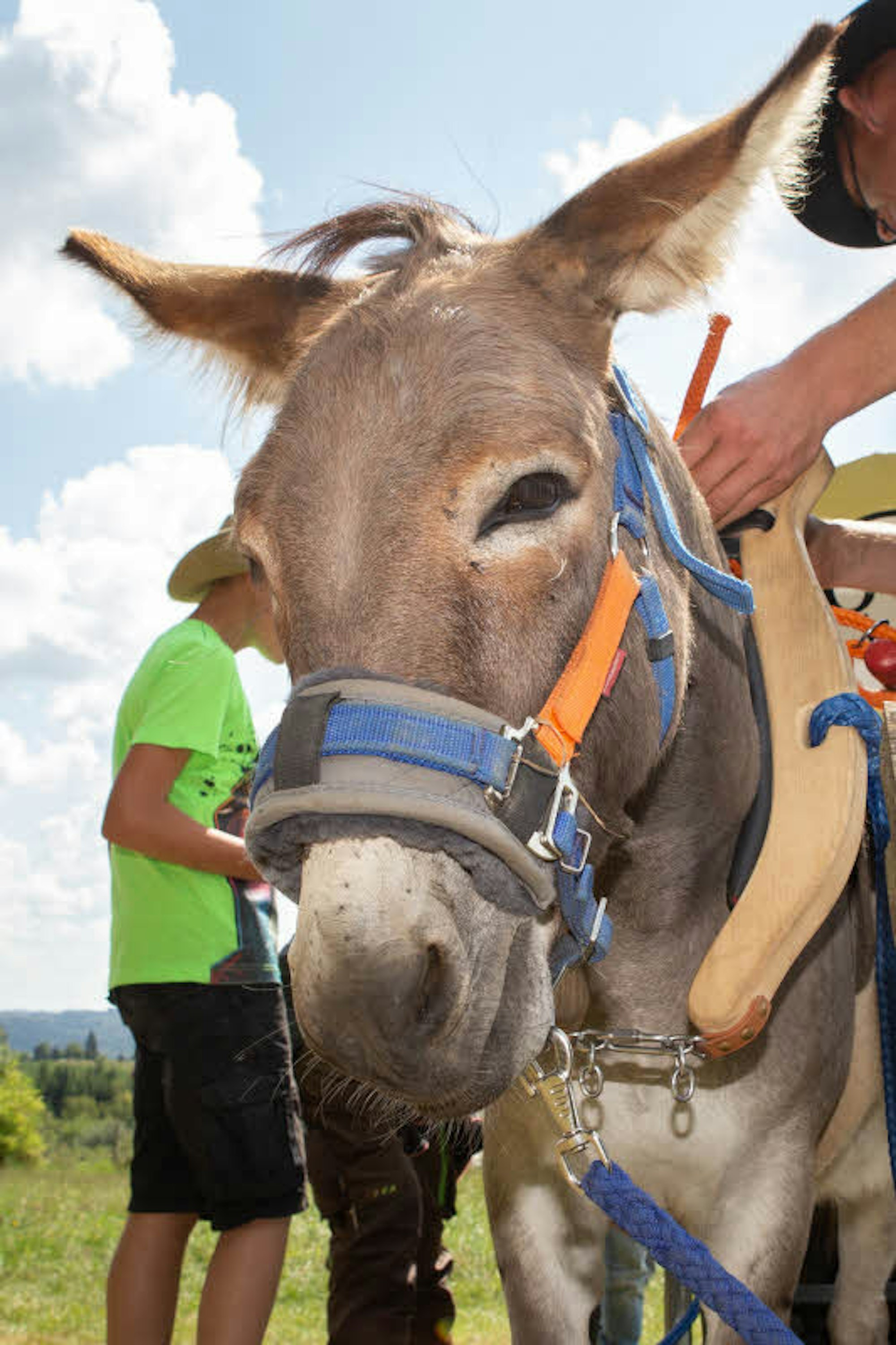 Auch Nachbarn und Bekannte sind vorbeigekommen. Von weitem erblicken sie schließlich die Pilgergruppe. Mit dabei sind ein Esel und ein Pony, die beide auf den Namen „Kalle“ hören. Der Esel zieht einen kleinen Planwagen. „Family on the Way“ steht darauf. Nach einer herzlichen Begrüßung werden die großen Rucksäcke abgeladen und die Tiere auf die Weide geführt. Bei Chilli con Carne und Käsekuchen, den sich Leni zu ihrem zehnten Geburtstag gewünscht hat, sitzen alle beisammen.