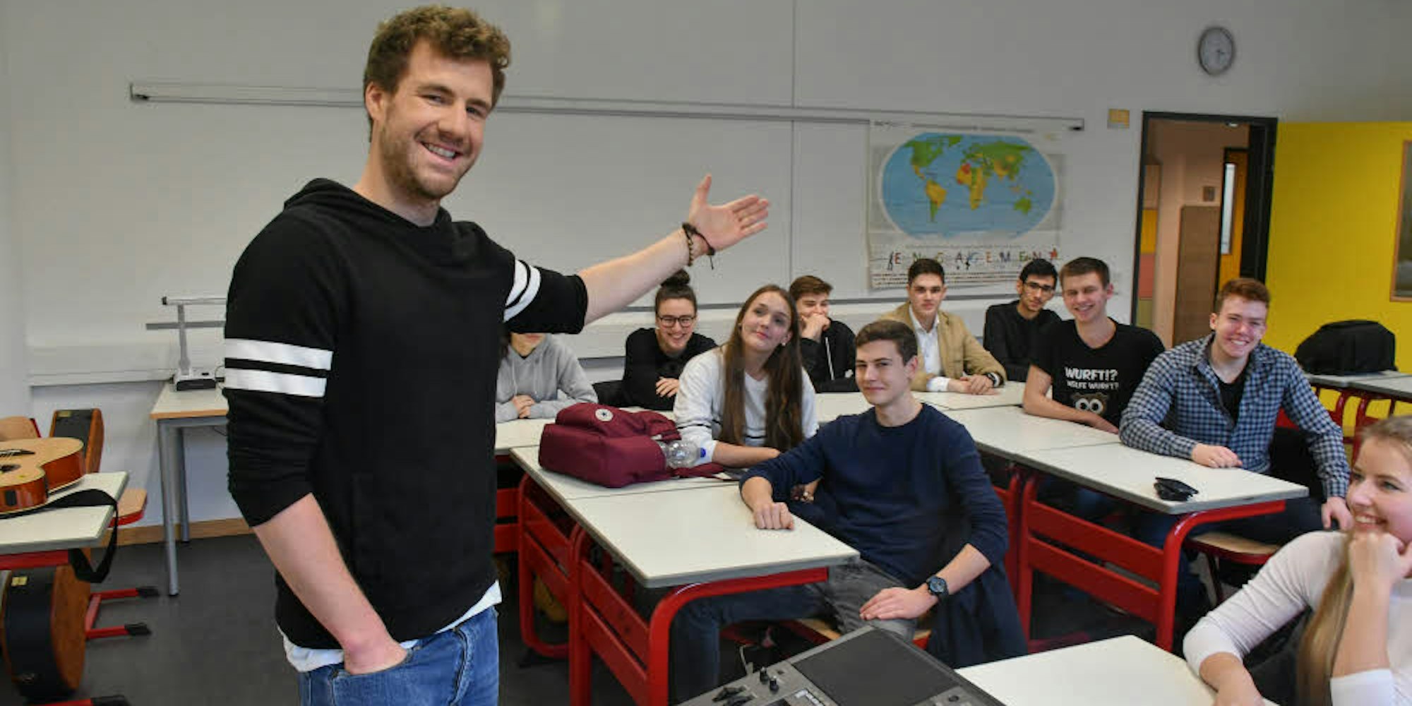 Hinsetzen, zuhören, lachen! Luke Mockridge (l.) störte gestern den Unterricht – mit Erlaubnis der Schulleitung.