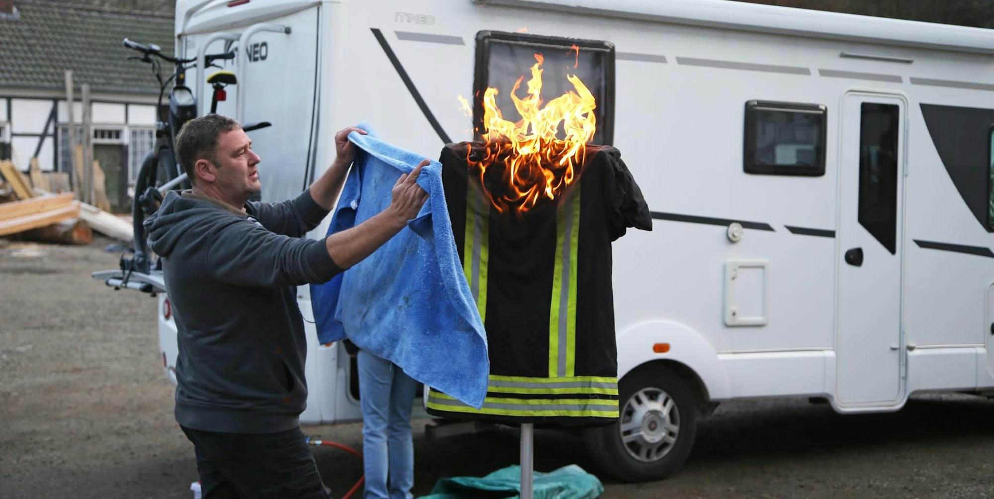 Marieheide-Gimborn – Der Feuerwehrmann nimmt ein Handtuch zur Hilfe. Mit Wasser getränkt, sei es das perfekte Mittel zum Löschen eines Feuers, sagt der Experte. Zur Veranschaulichung zündet er ein Jacke großflächig an, deckt dann die Flammen mit dem Handtuch ab und wischt mehrmals darüber. „Wichtig ist, dem Feuer den Sauerstoff zu nehmen.“ Zwölf Männer und Frauen schauen interessiert zu.