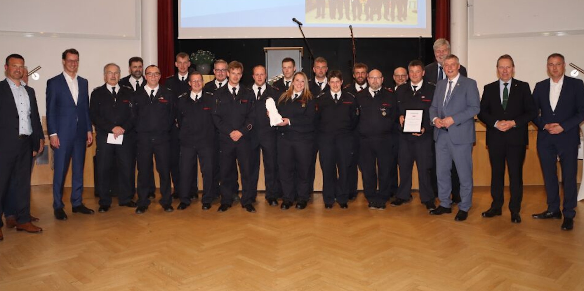 Gruppenbild mit Ministerpräsident Hendrik Wüst: Die Feuerwehr freute sich über die vielen Gratulationen.