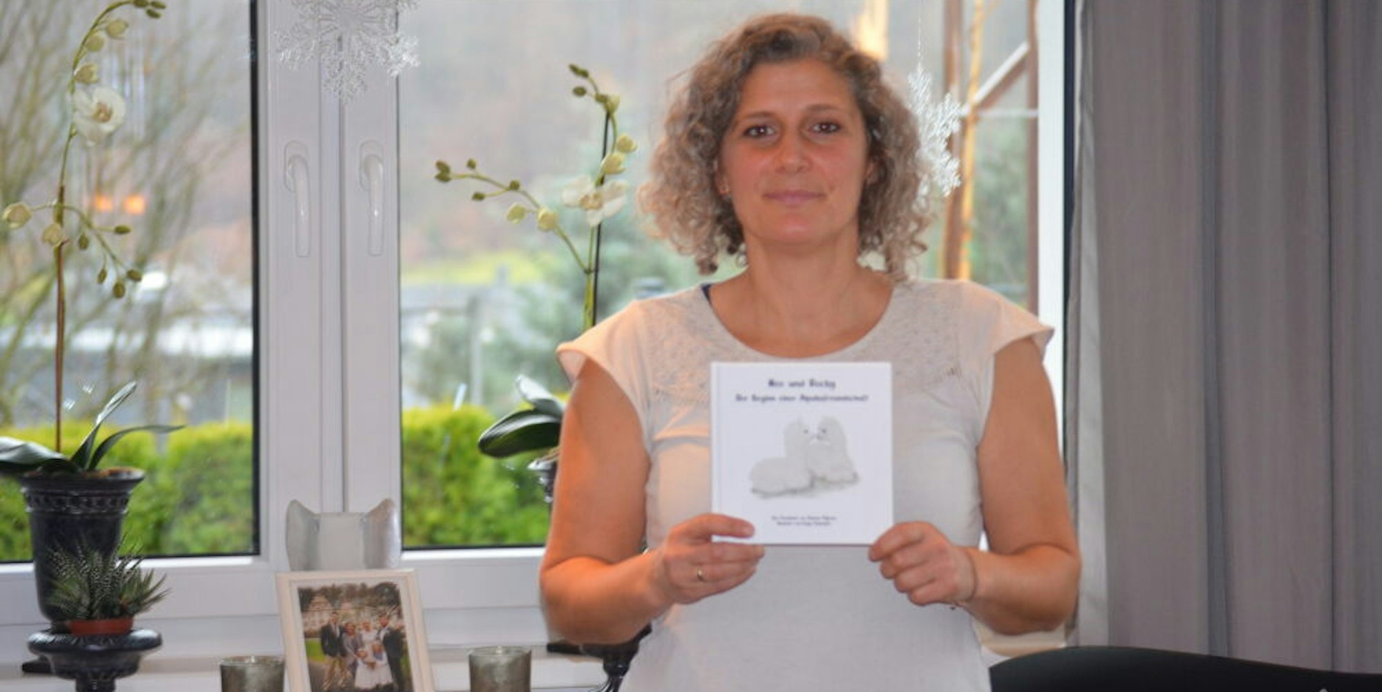 Daniela Pilgram mit ihrem Buch über die Alpakafreundschaft von Neo und Rocky.