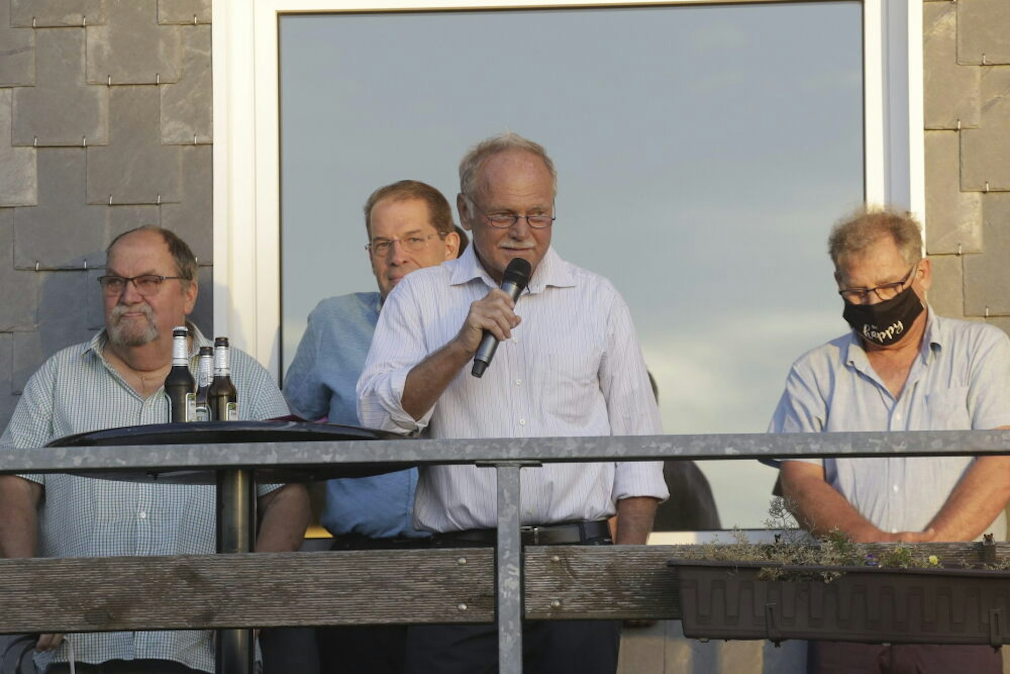 VfB-Vorsitzender Günter Größ (3.v.l.) gab das Startsignal für das Einschalten der neuen LED-Flutlichtanlage auf dem Sportplatz.