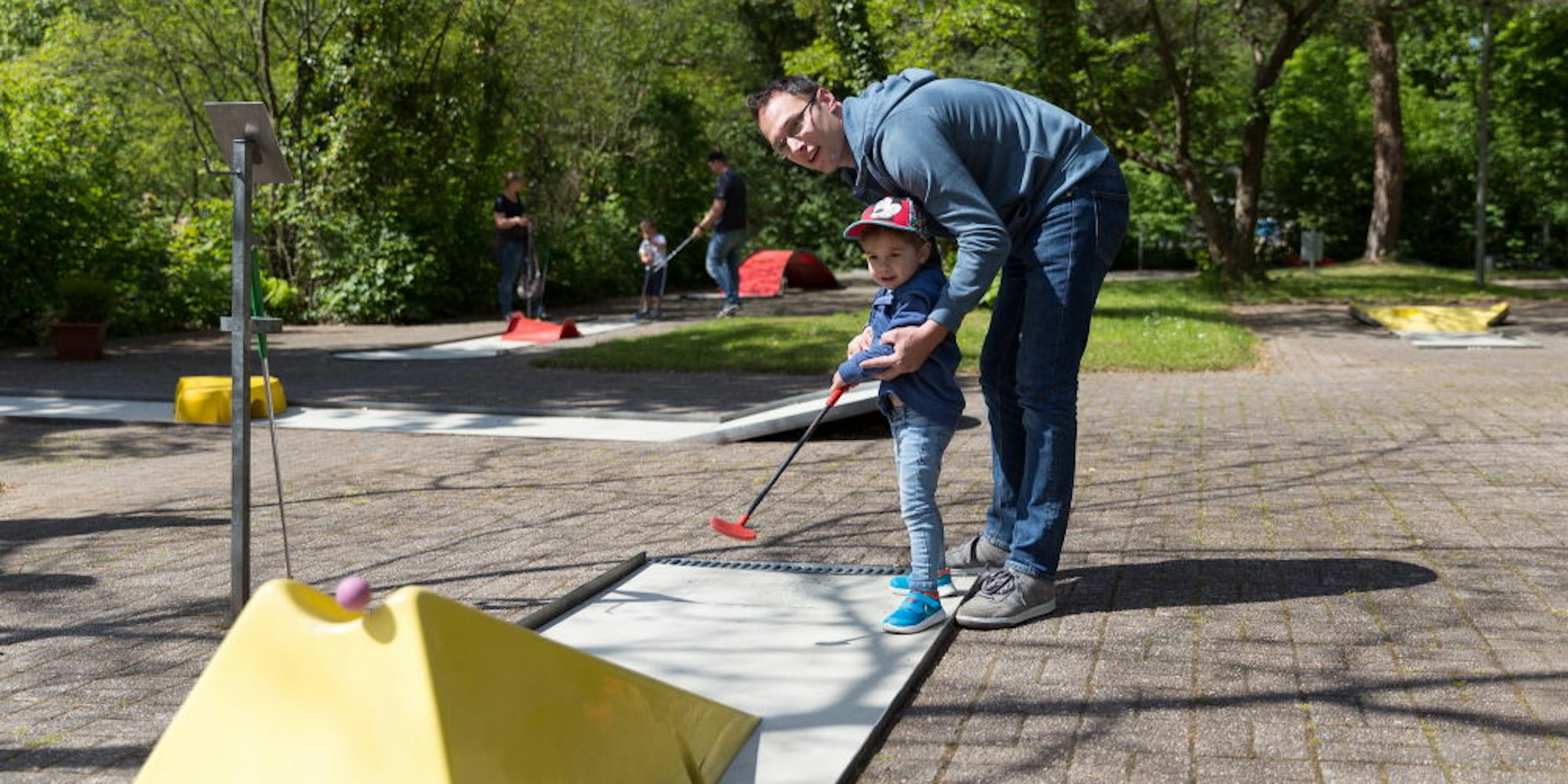 Mit viel Abstand, aber immerhin ohne Maske kann hier Fabian Hamm mit Sohn Noah Minigolfspielen.
