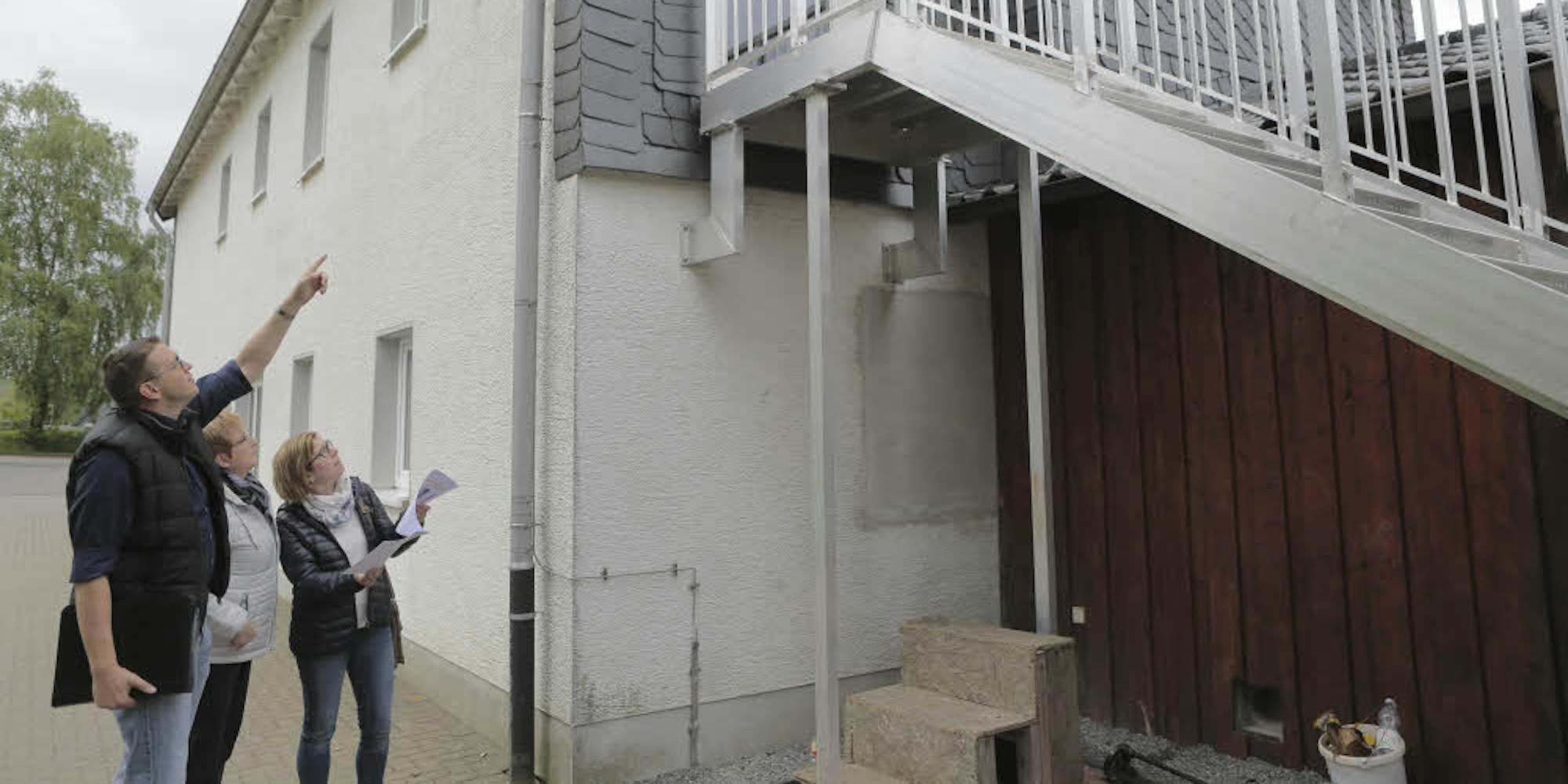 Neben der Treppe soll der Aufzug entstehen, erläutern (v.l.) Marko Feldhoff, Mechthild Schwamborn und Simone Habernickel.