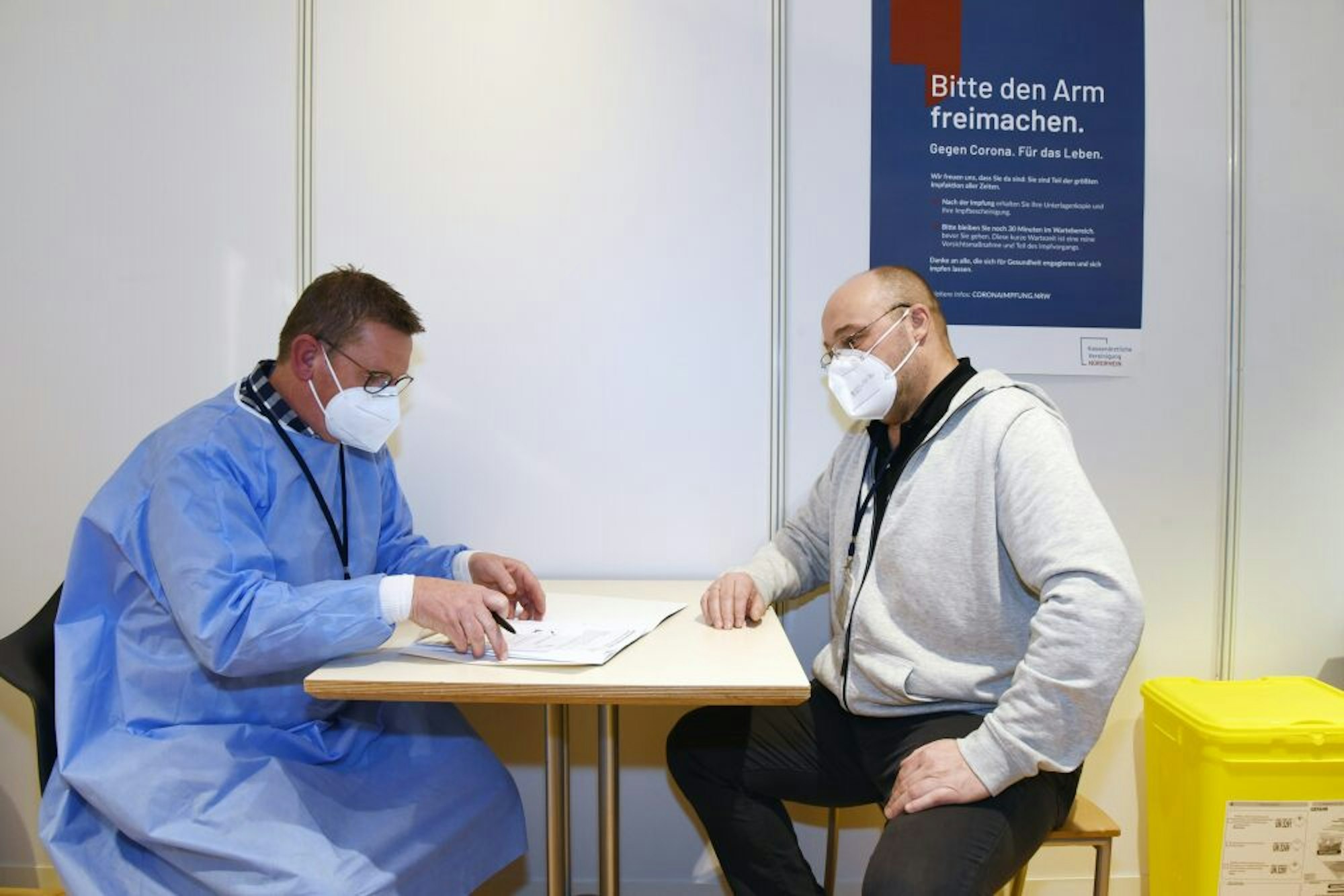 Die Schalter sind doppelt besetzt: Ein Mitarbeiter der Kassenärztlichen Vereinigung ist für die Registrierung in medizinischer Hinsicht zuständig, inklusive Überprüfung der Anamnese-Bögen, und ein Mitarbeiter der Kreisverwaltung erhebt die Daten der Besucher. Wer seinen Bogen vergessen hat, wird aber nicht nach Hause geschickt – er kann vor Ort einen neuen ausfüllen, so Ammann. „Wir wollen alle, die eine Termin haben, auch impfen“, sagt er.