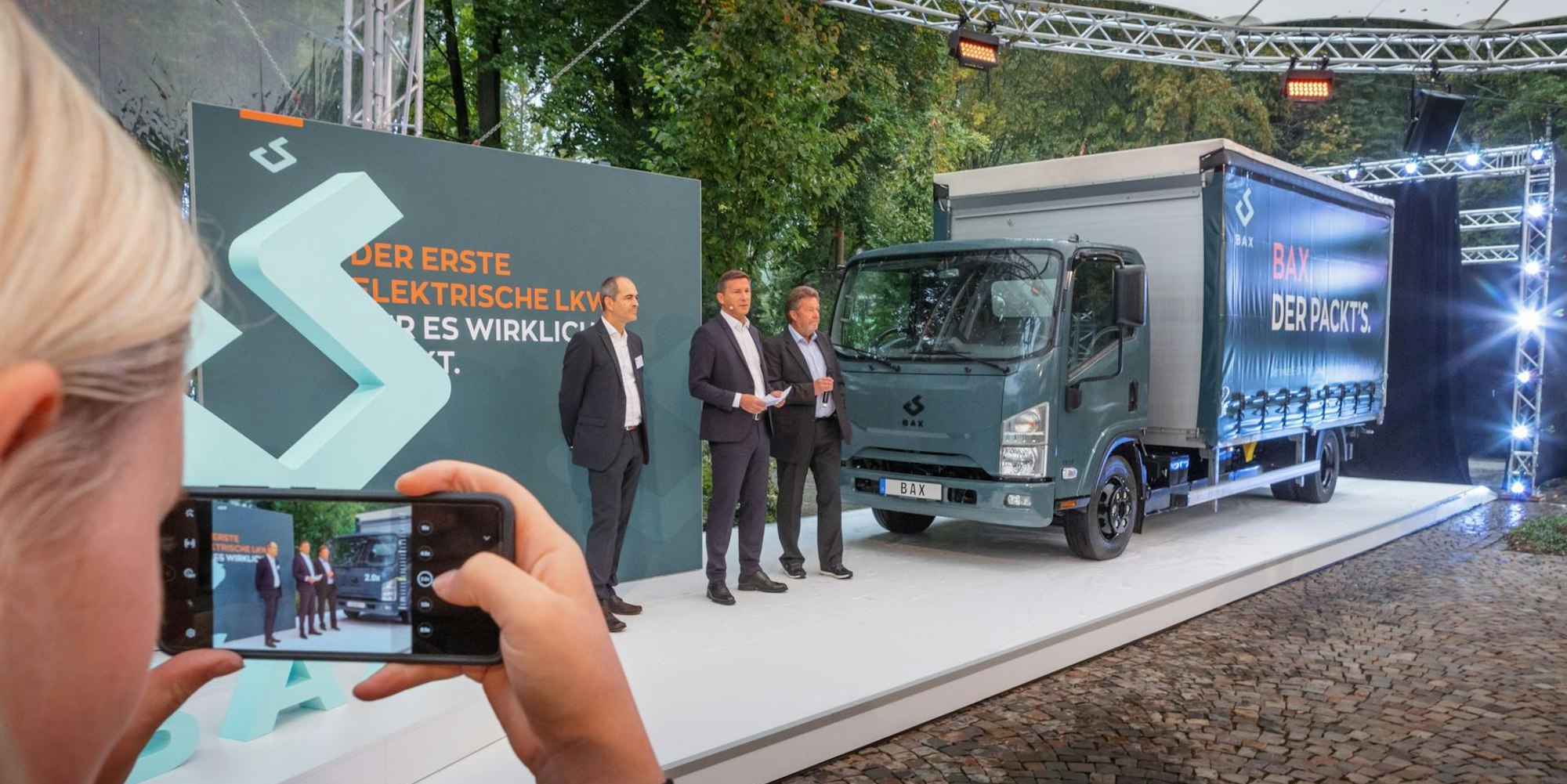 Wiehl – Markus Schell hatte das Besondere des Momentes im Sinn. „Nicht in München, nicht in Stuttgart, nicht in Lyon oder Göteborg stellen wir Ihnen heute unseren neuen E-Lkw vor“, rief der geschäftsführende Gesellschafter der BPW Bergische Achsen KG am Donnerstagmorgen. Kurz darauf öffnete sich der Vorhang, und der erste Bax rollte auf die Bühne.