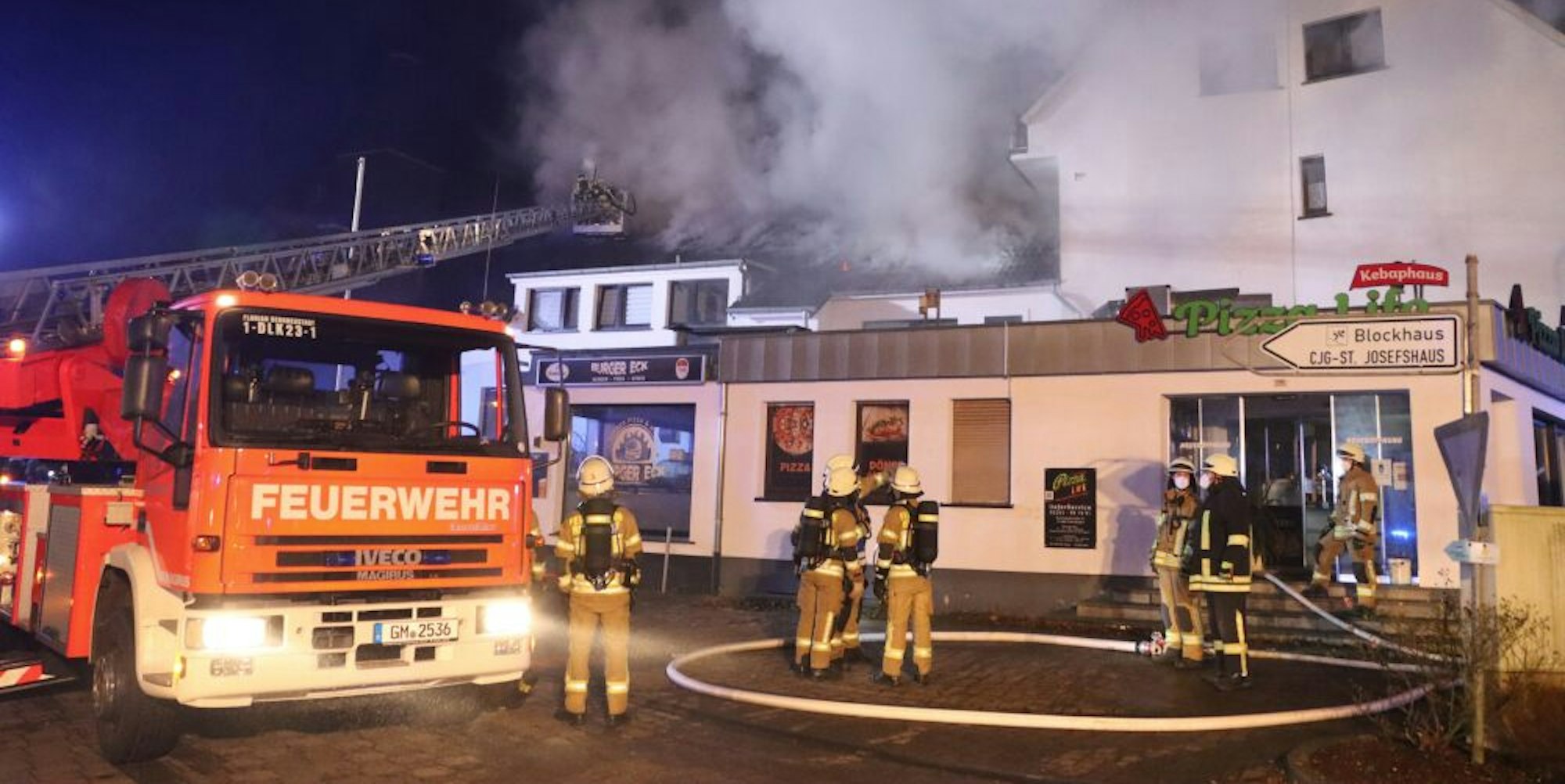 Eckenhagen – Am Sonntagabend war ein Großaufgebot der Reichshofer Feuerwehr in die Blockhausstraße im Ortskern von Eckenhagen im Einsatz. Gegen 20.40 Uhr erfolgte die Alarmierung wegen eines Zimmerbrandes, schildert Sascha Frede, stellvertretender Wehrführer von Reichshof. Beim Eintreffen war ein deutlicher Flammenschein erkennbar gewesen, der Brandgriff schon auf den Dachstuhl über.