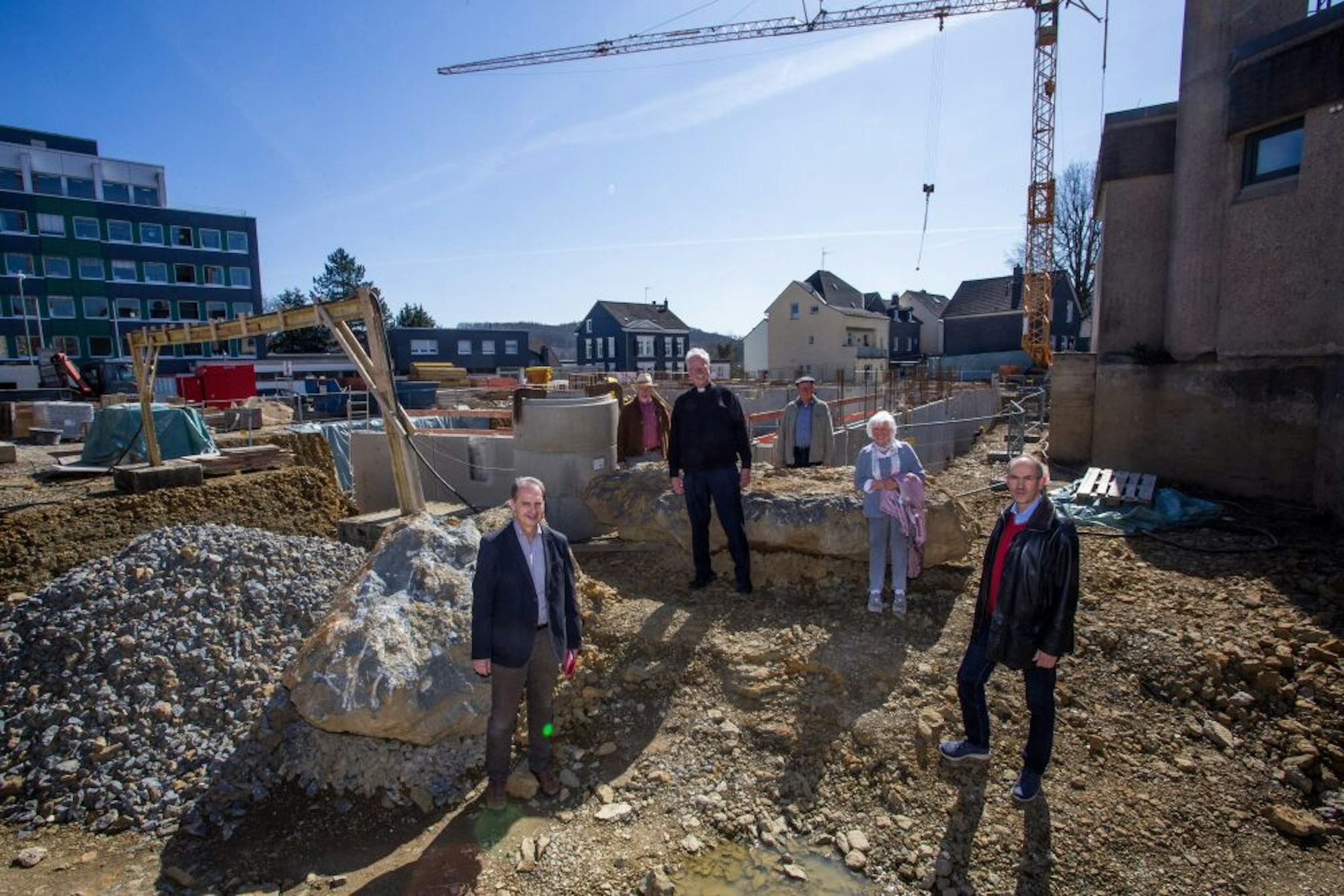 Das Team um Caritas-Direktor Peter Rothausen (r.) und Kreisdechant Christoph Bersch (M.) vor den riesigen Felsbrocken auf der Baustelle.